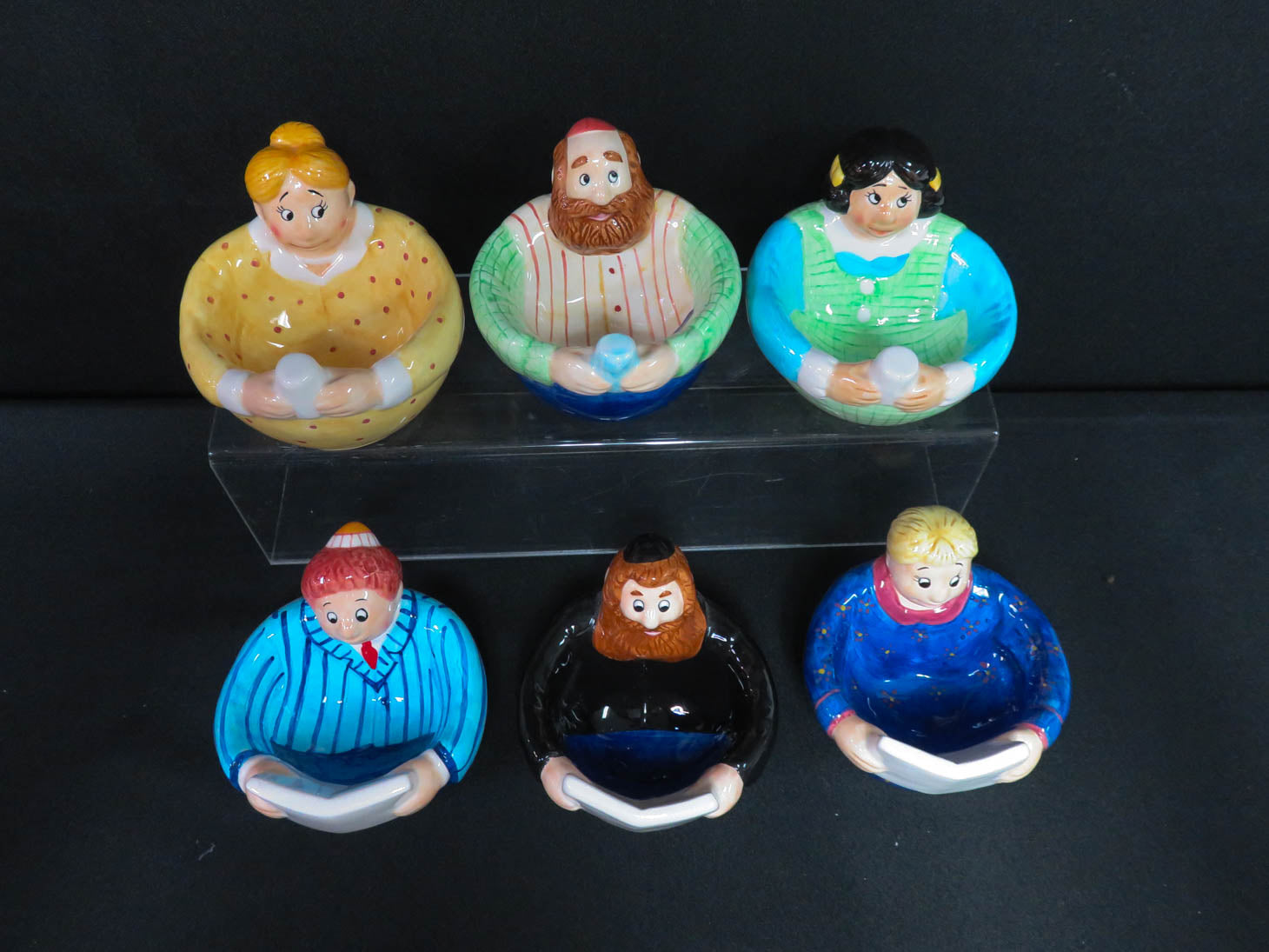 Has 6 character bowls at the seder table. Made in 1999. 7 pcs