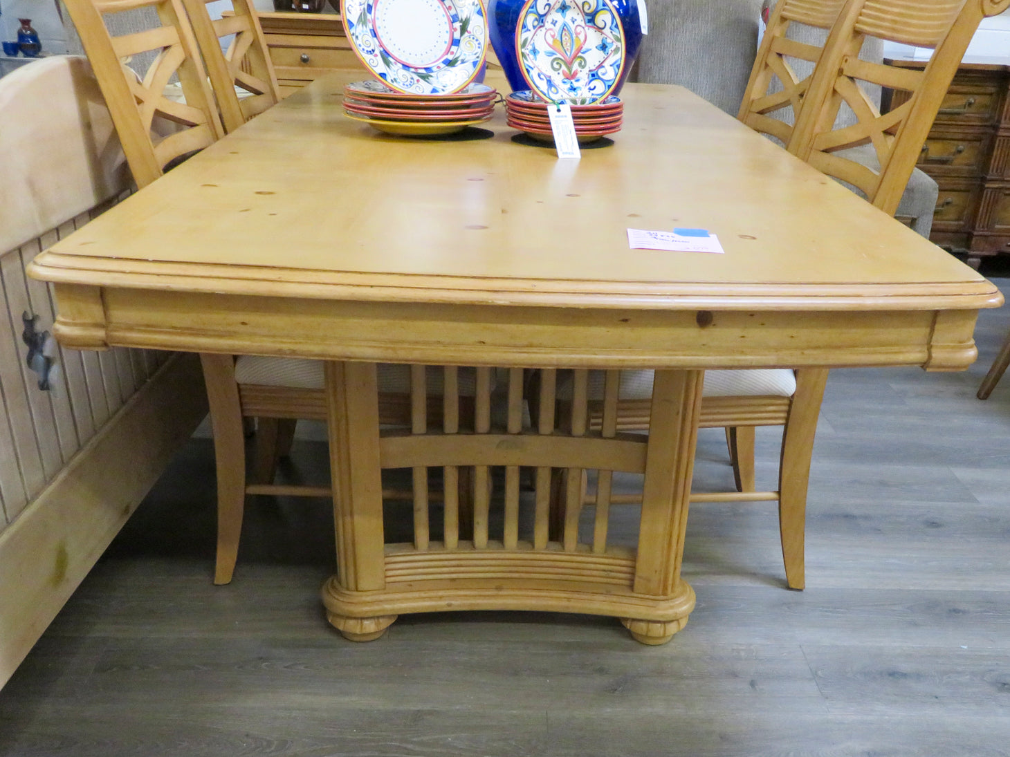 Self-stored 18" leaf, on two wide pedestals. Six X-back chairs with cream upholstery on seats.