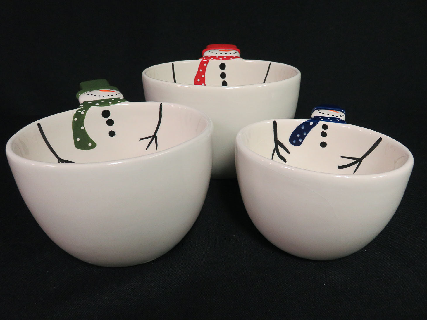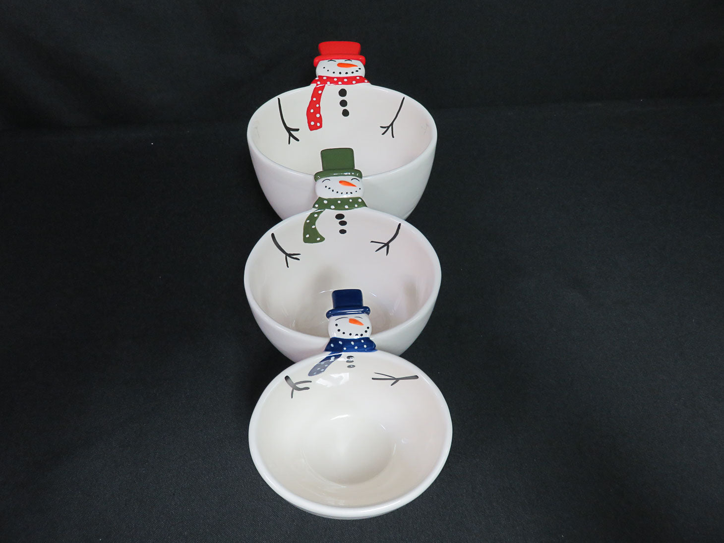 Item Number: 482-342 Set of 3, white with red, blue, and green snowman handles by Boston Warehouse. Largest: 5.75" x 7" x 4"