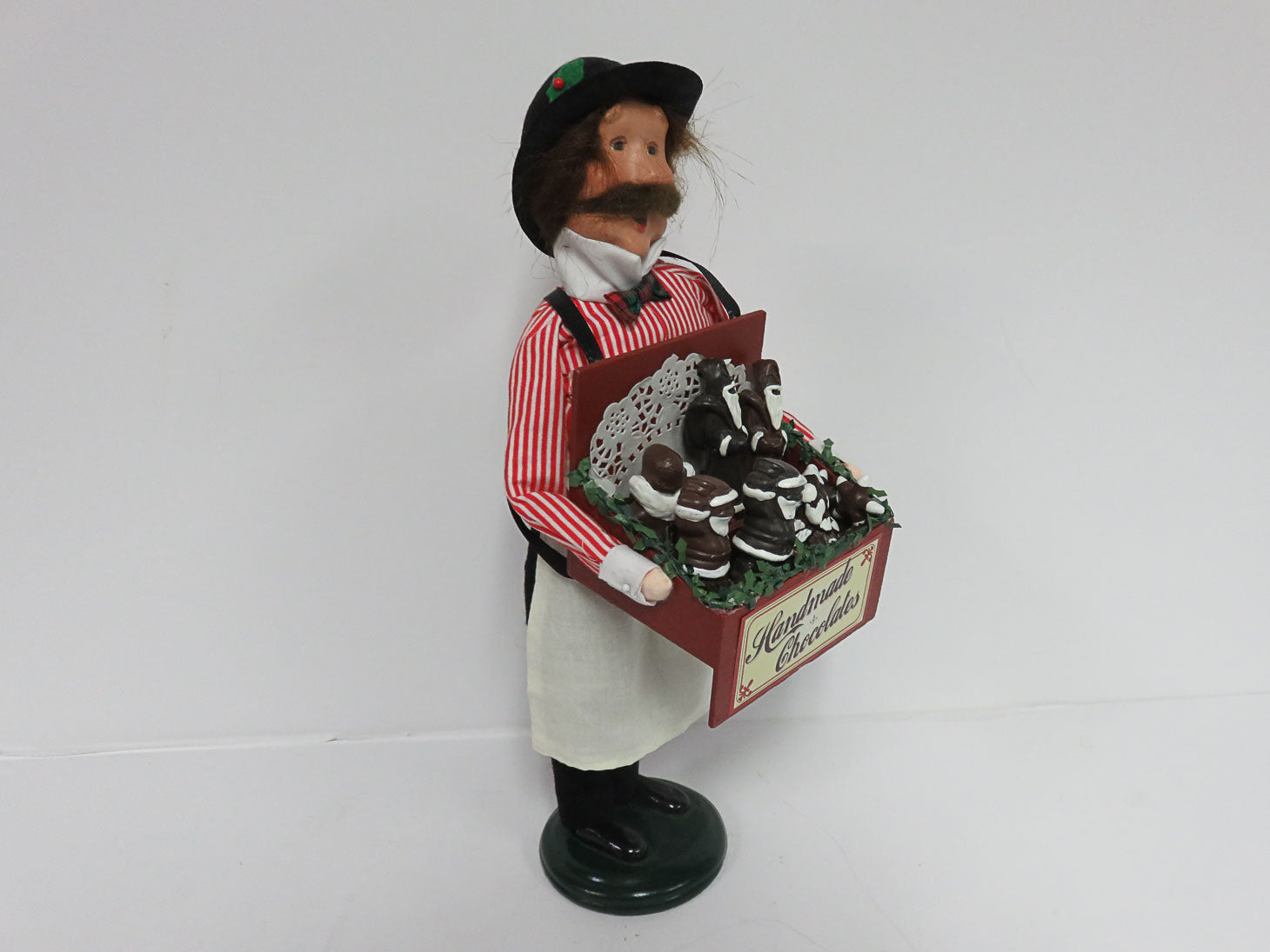 Red striped shirt and back hat, holding box of handmade chocolate Santas and trees