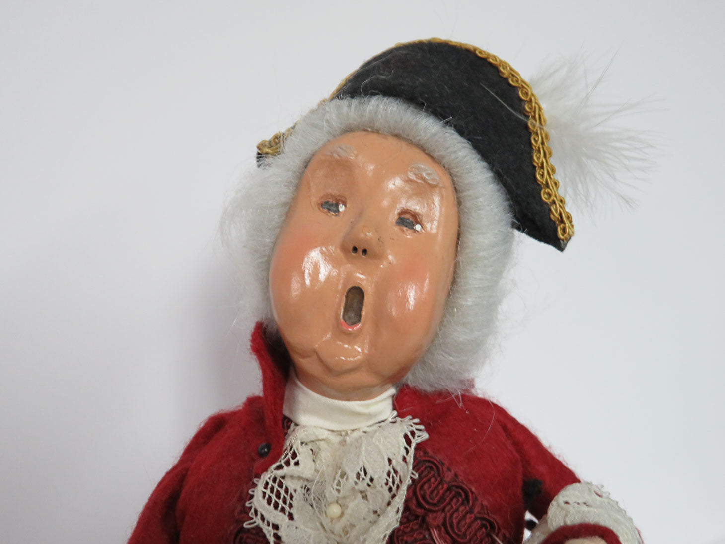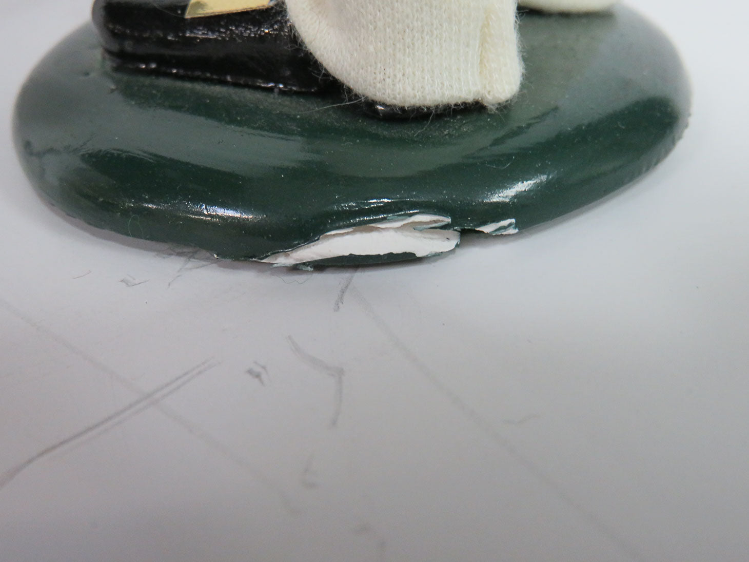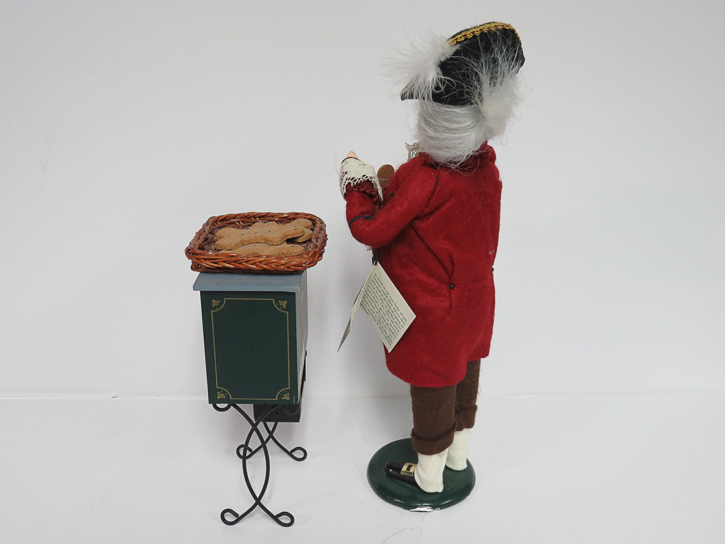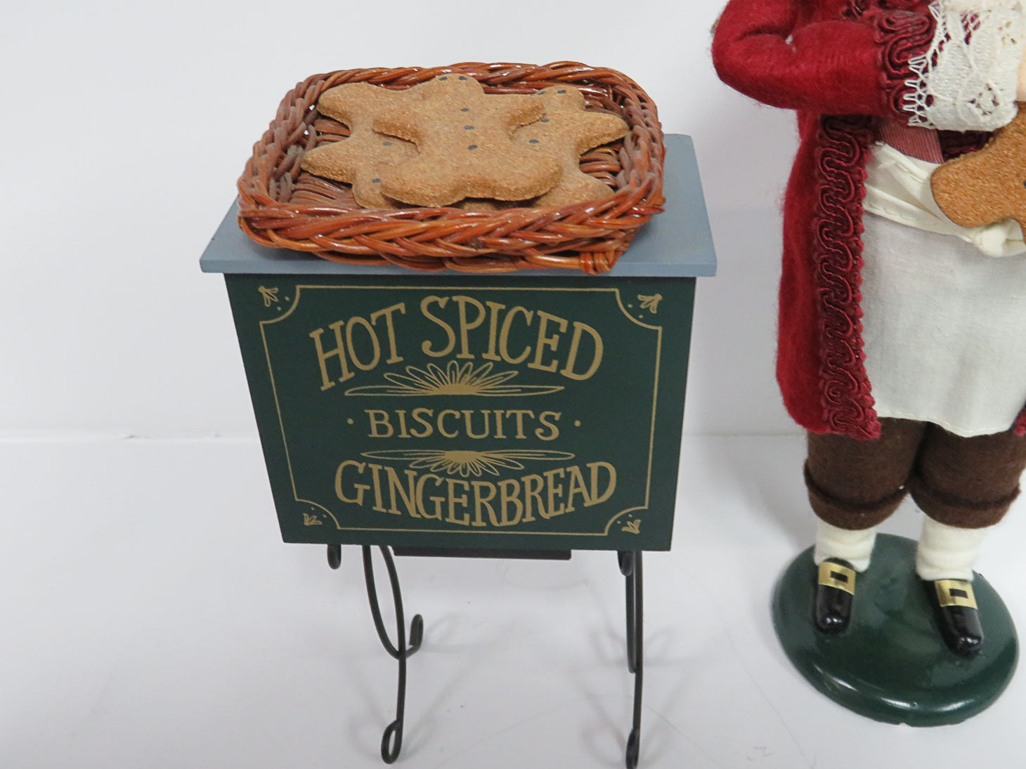 Gingerbread vendor with cart, burgundy jacket, holding gingerbread man, 2 pc, chip on base