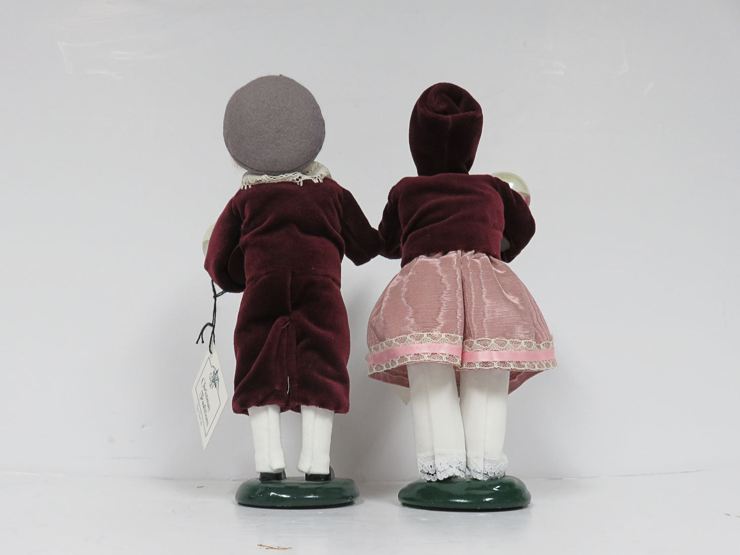 Boy and girl with snow globes, burgundy velvet jackets, pink skirt, 2 pc