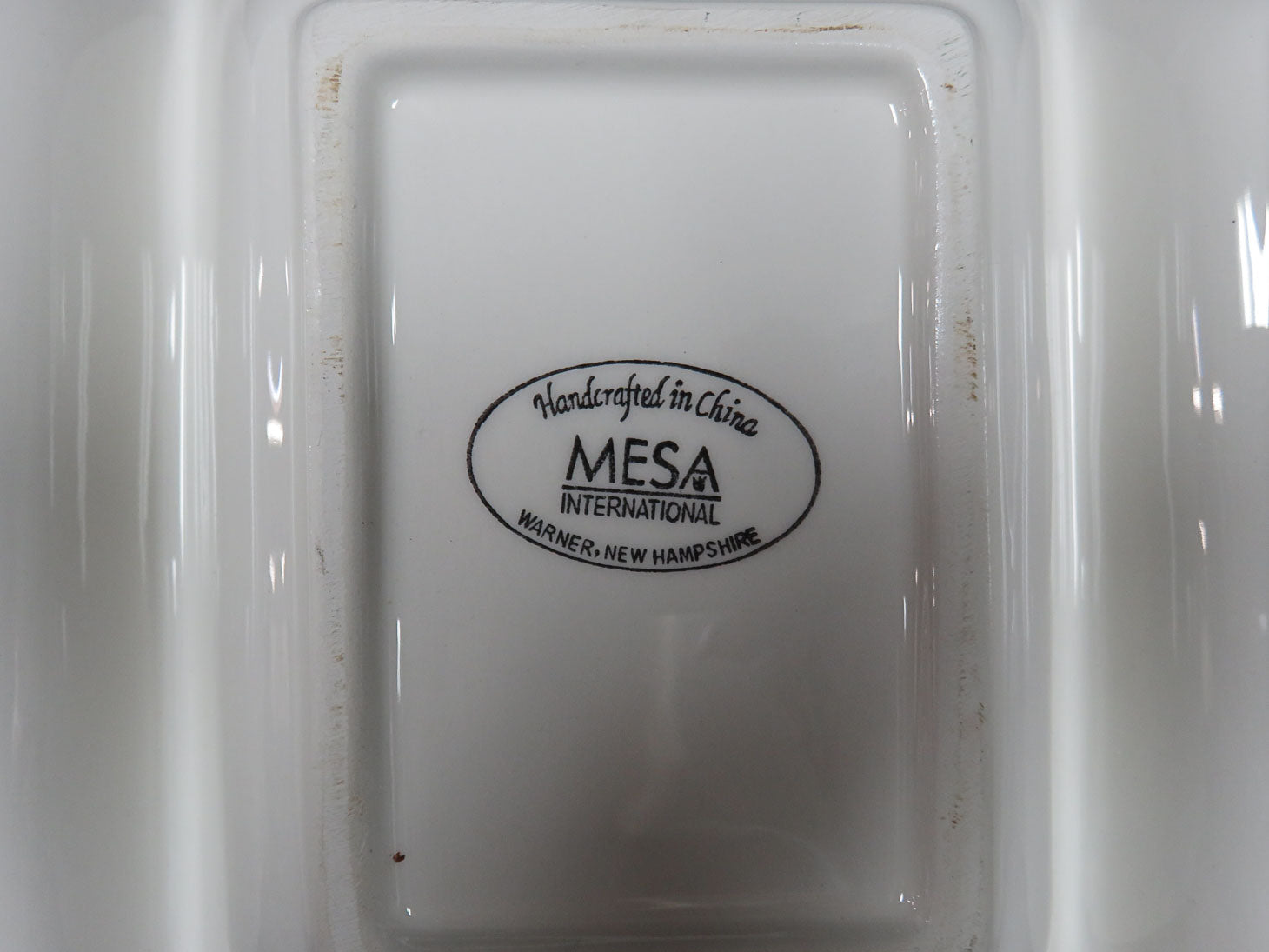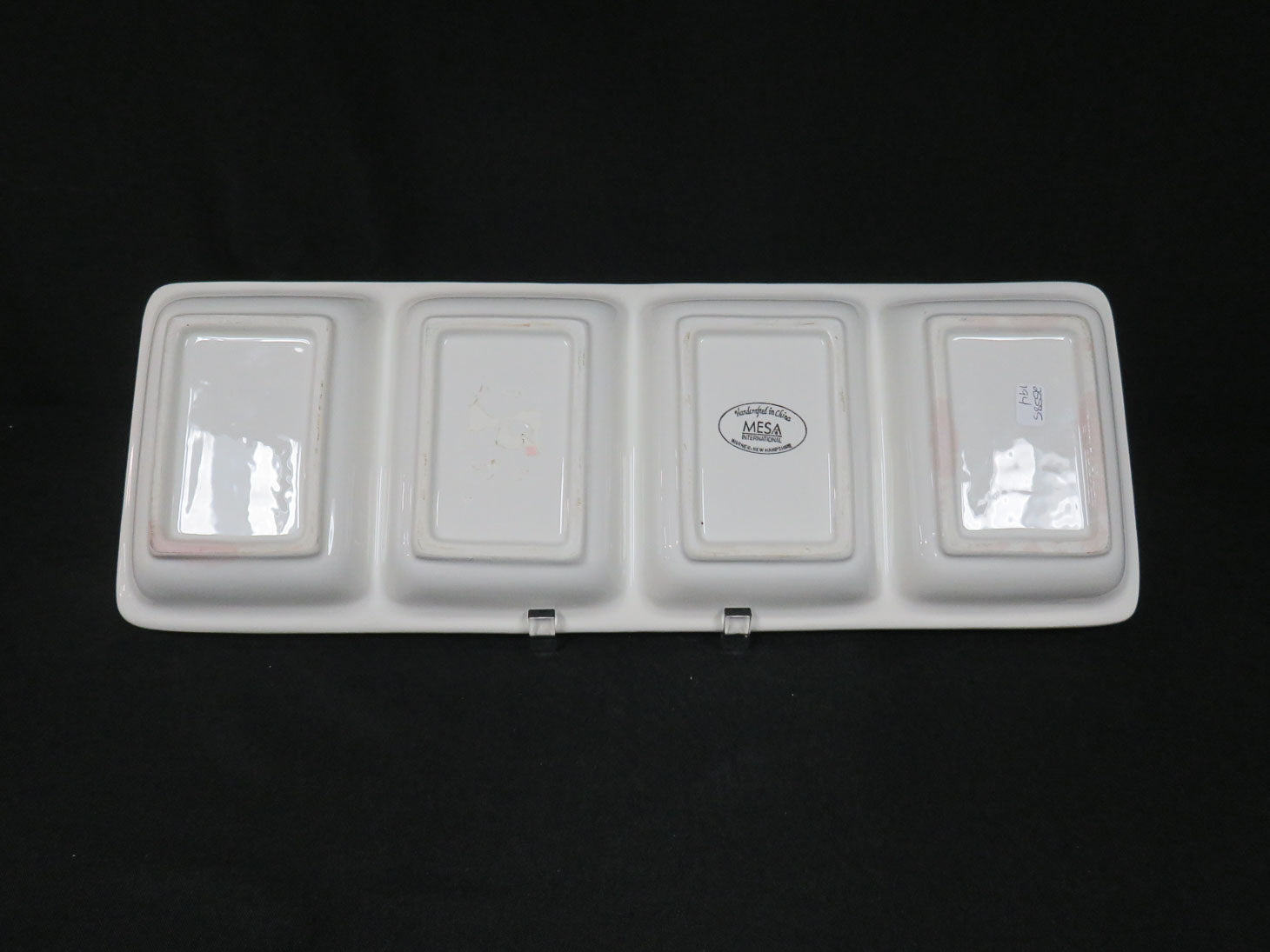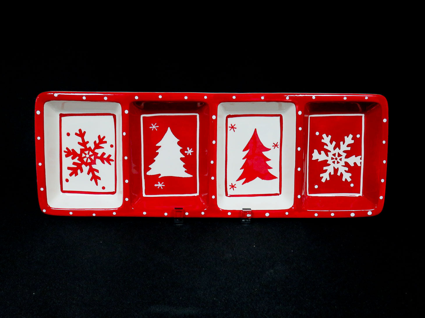 Red and white, 4 sections, snowflakes and Christmas trees motif by Mesa International. 18" x 6.5" x 1.5"