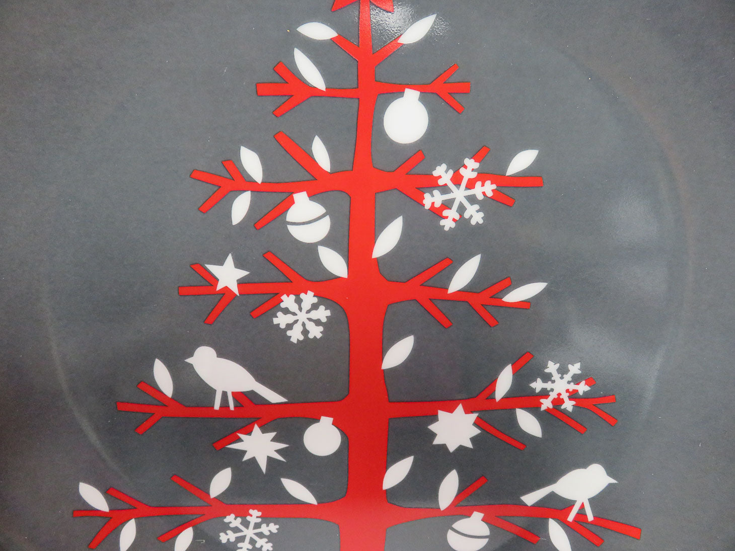 Round grey platter with red tree, white birds, snowflakes and leaves