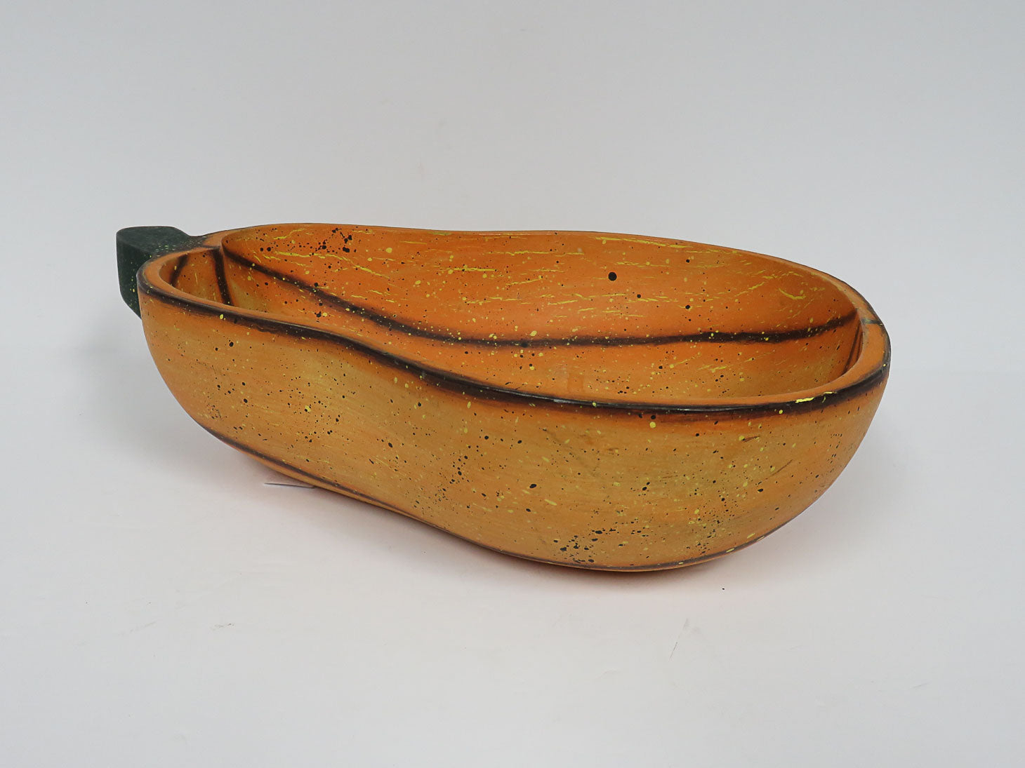 Gourd shaped, orange with brown veining and black and yellow splatter