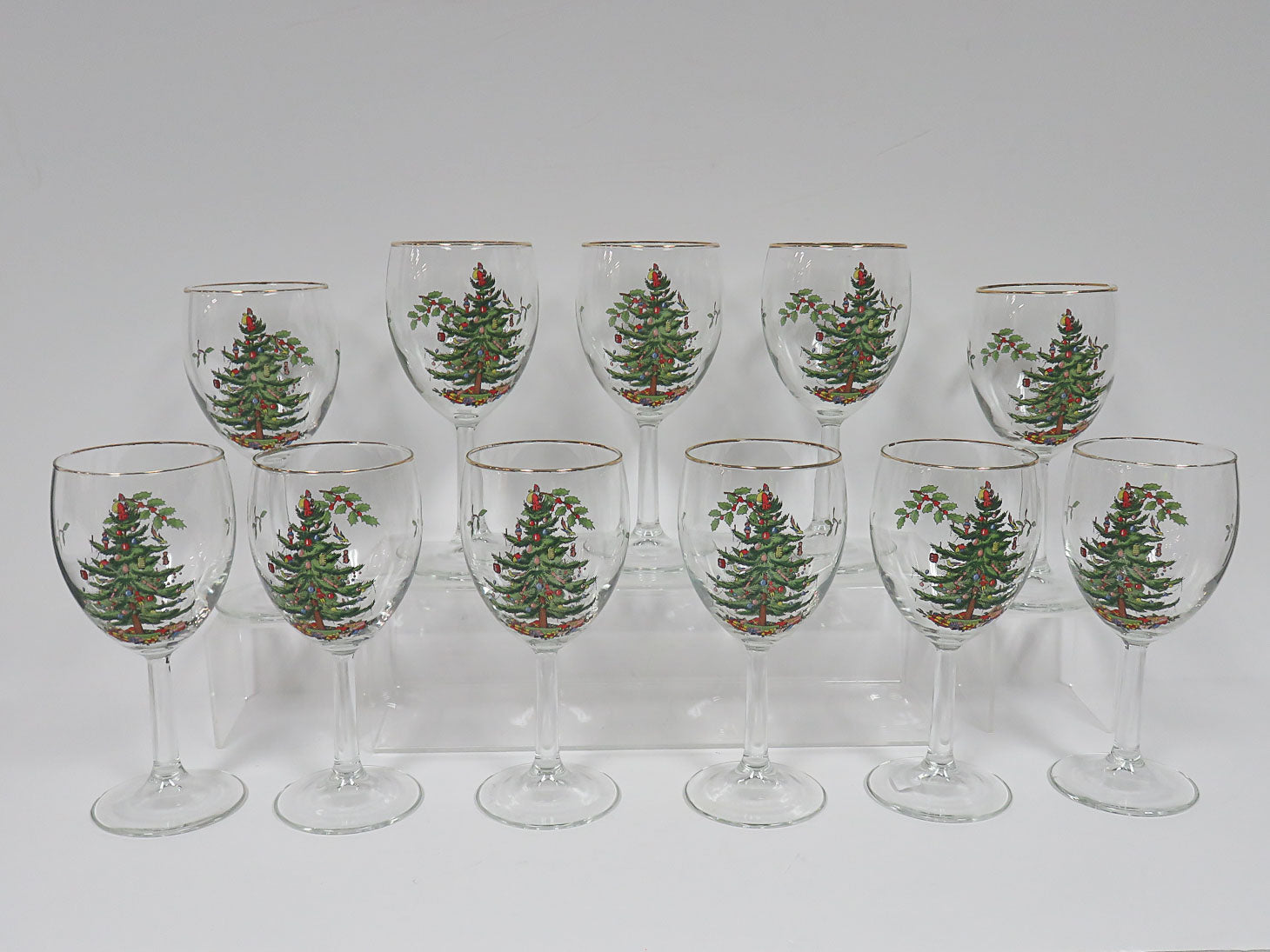 Set of 11 "Christmas Tree" wine glasses, gold rim