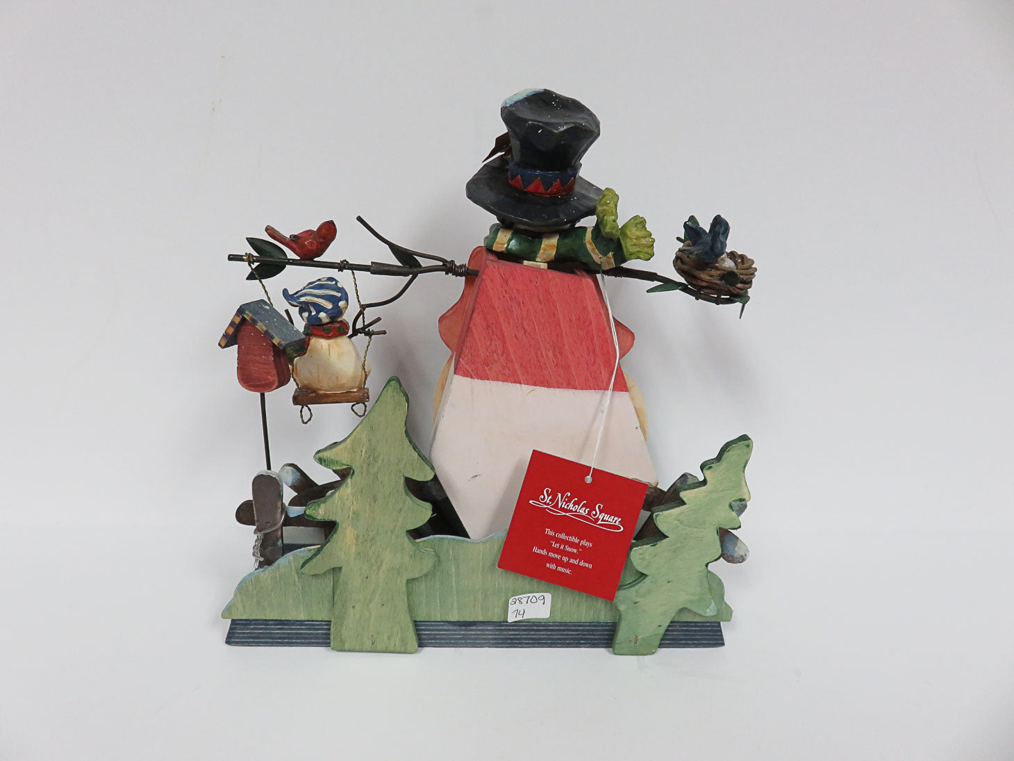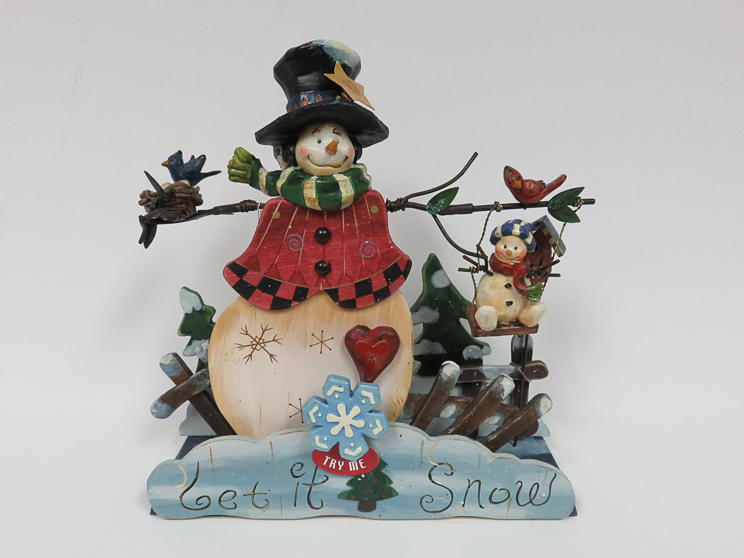 Snowman with branch arms, baby snowman on swing, "Let It Snow", twist snowflake for music