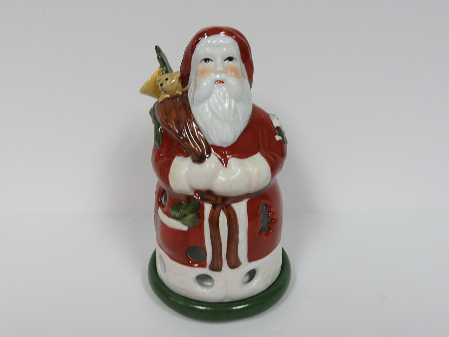 Santa with toy bag, holding horn and teddy bear, 2 pieces.