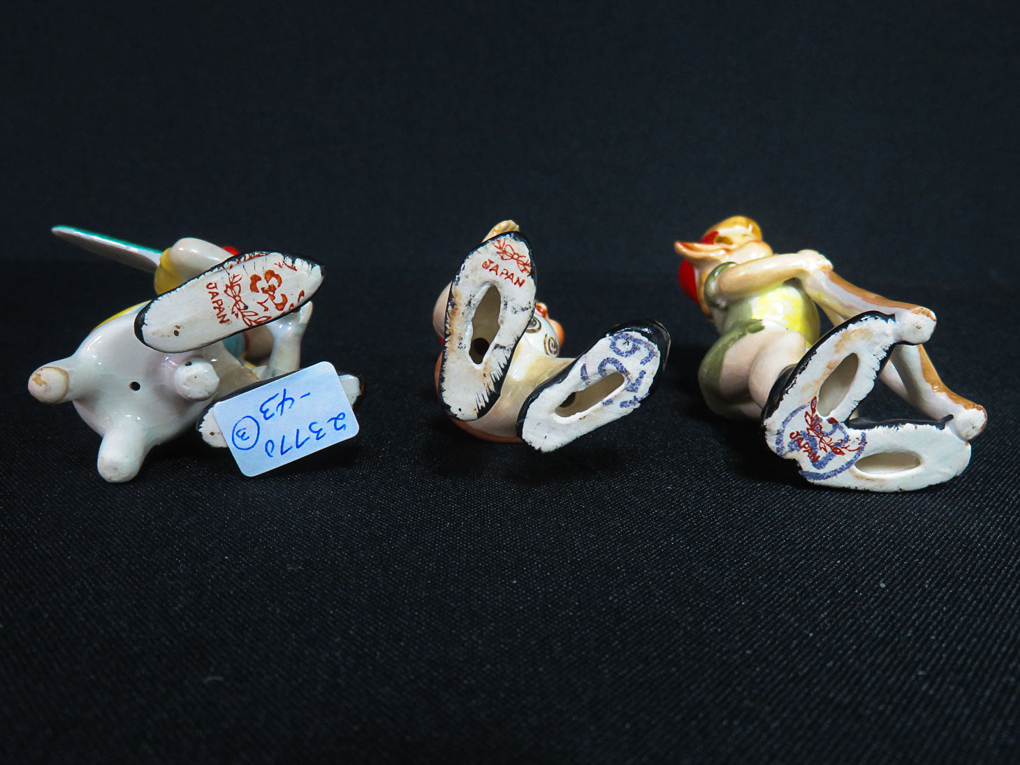 Three 1950s elves with red hats, various poses. One has tiny crack