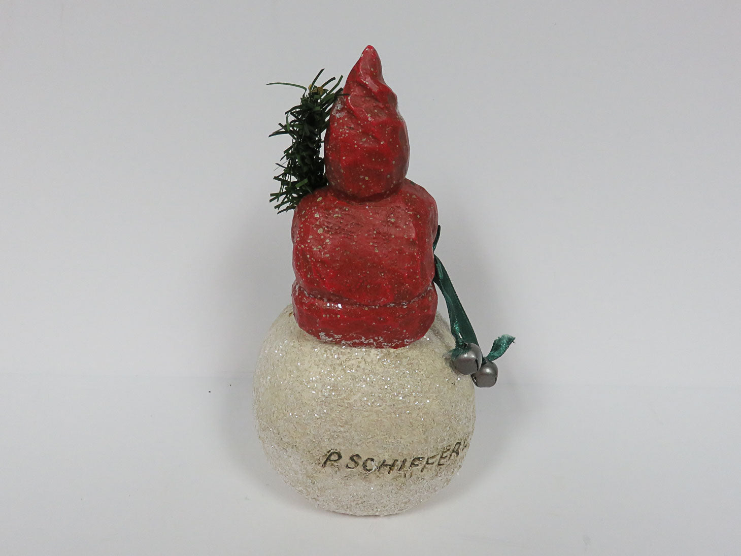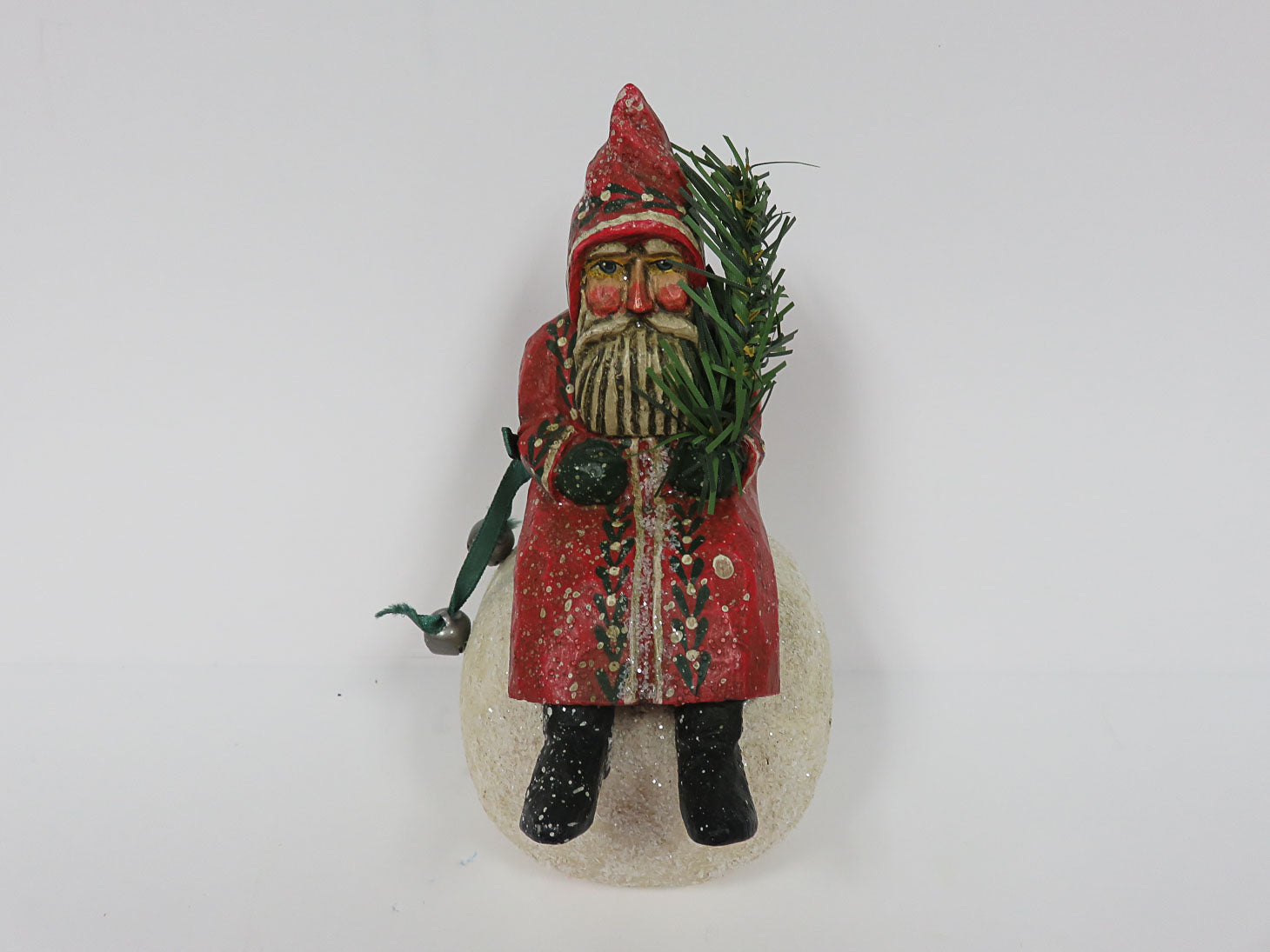 Hand painted Santa sitting on large snowball, holding a tree and bells.