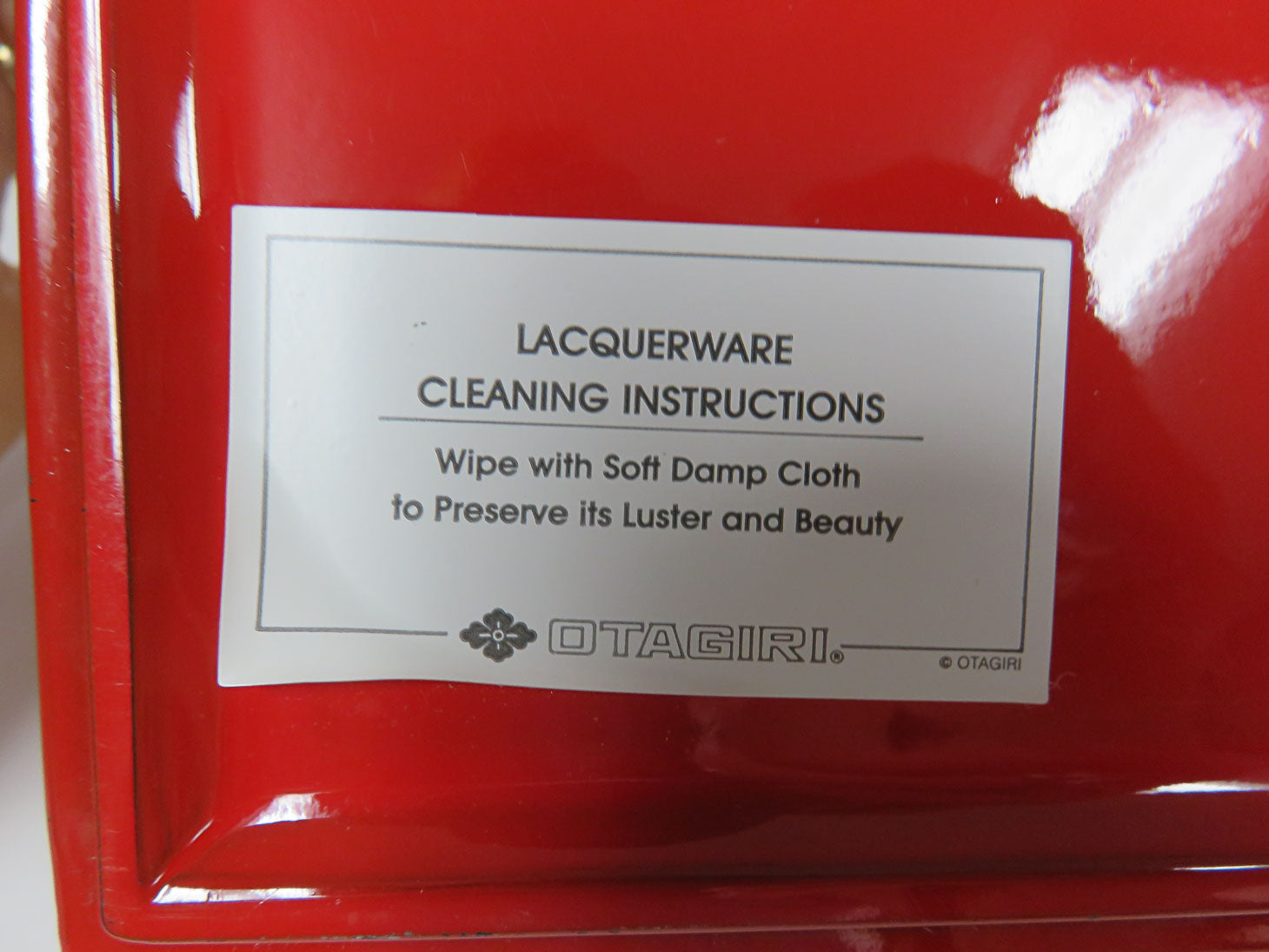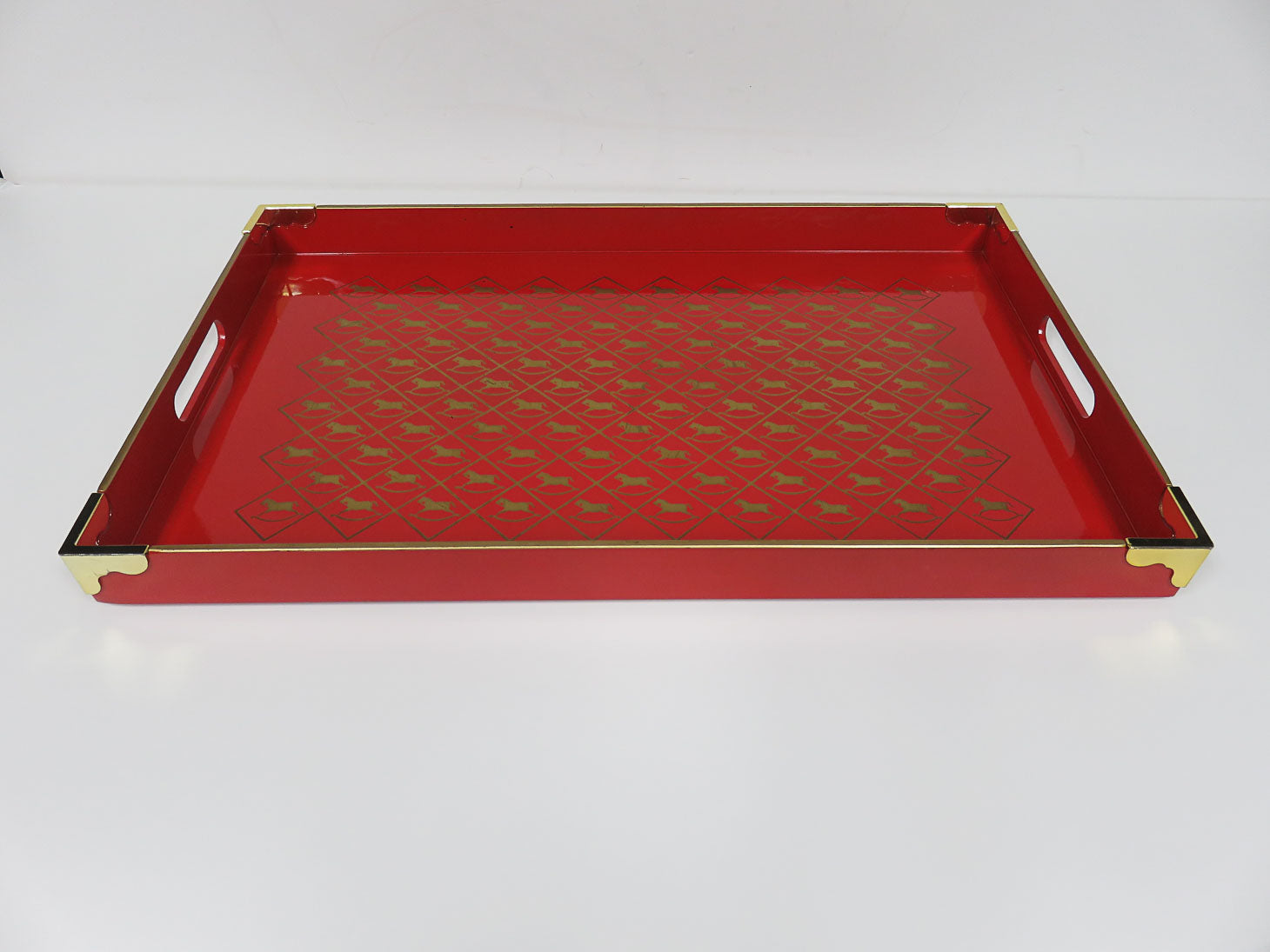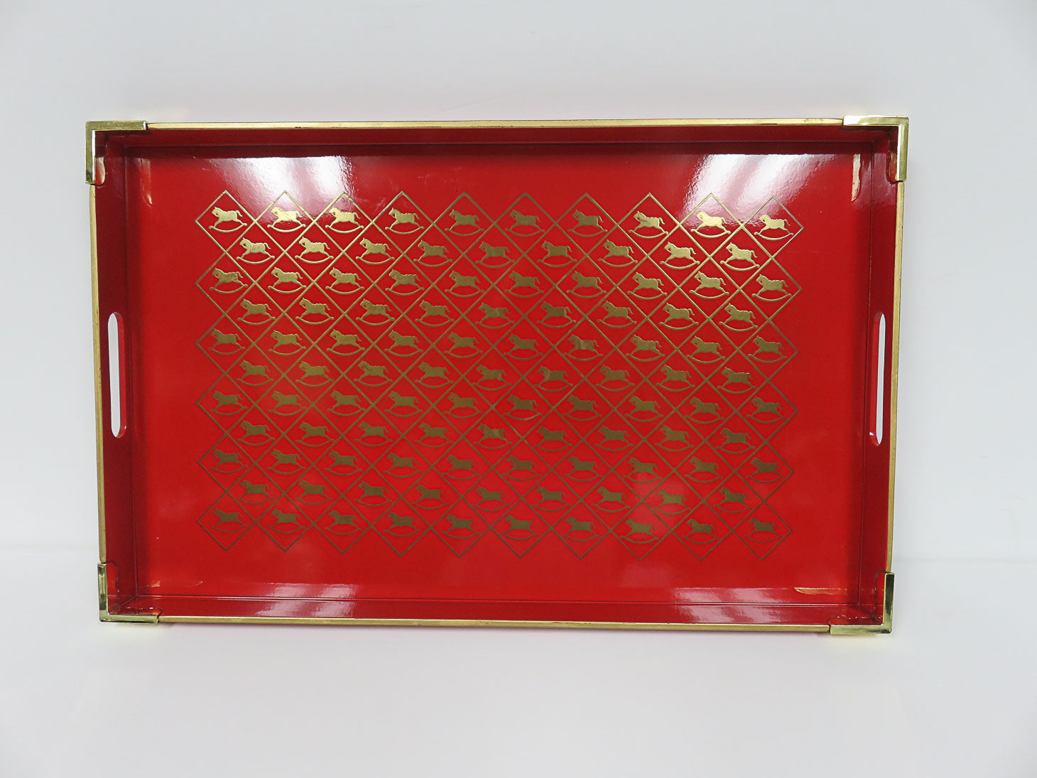 Rectangular, red lacquer with brass corners, gold rocking horse design
