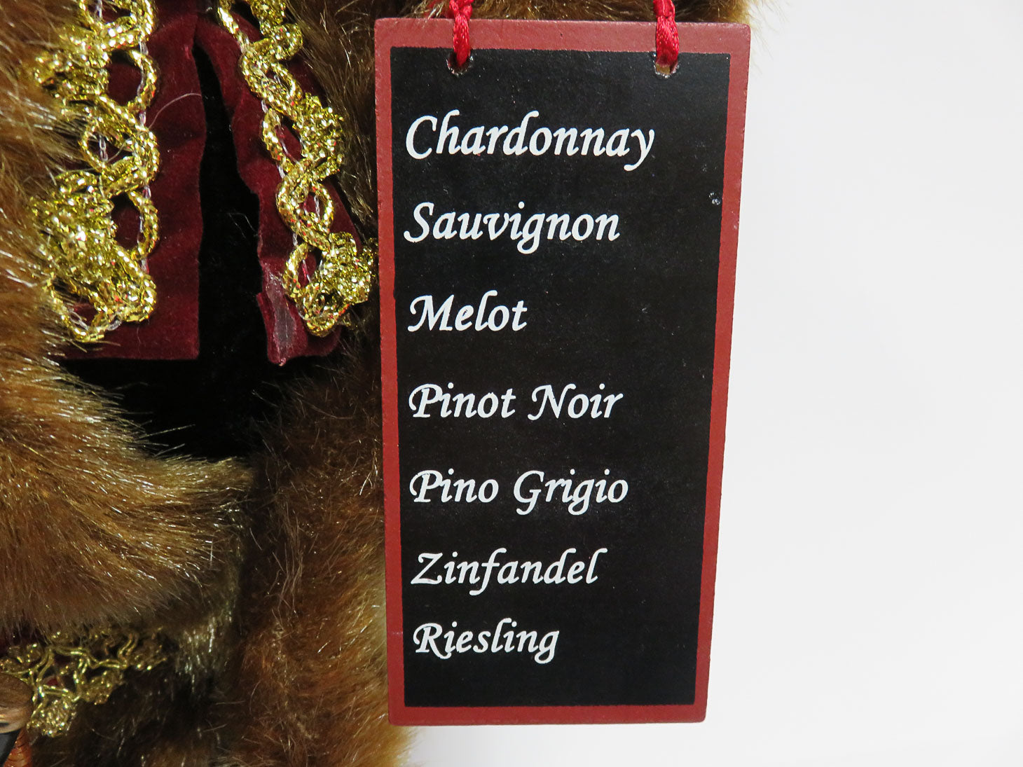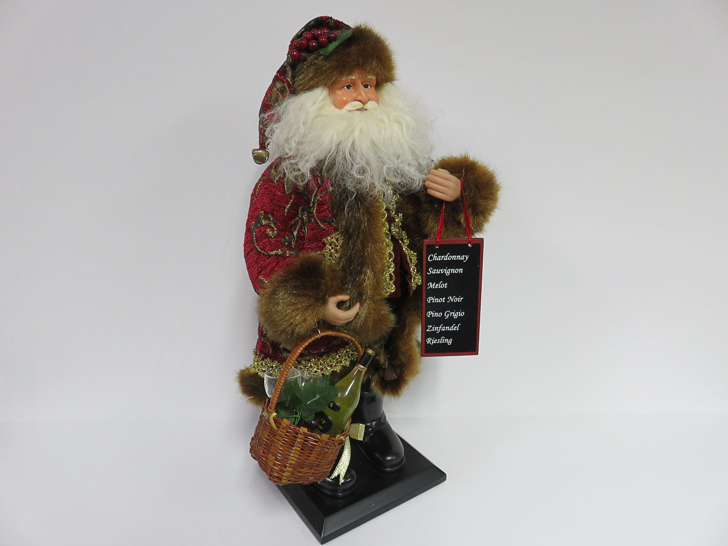 Brocade jacket with basket of wine, glasses, wine varietals on sign
