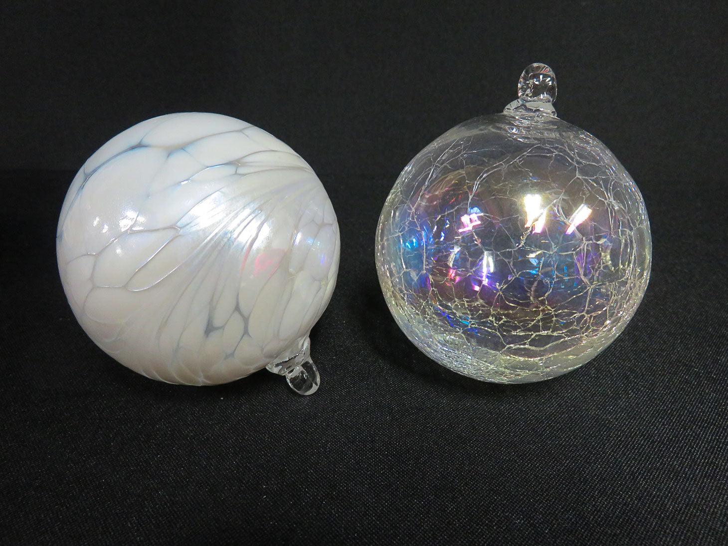 Set of 2, mouth-blown, one clear crackle glass, one white crackled in boxes