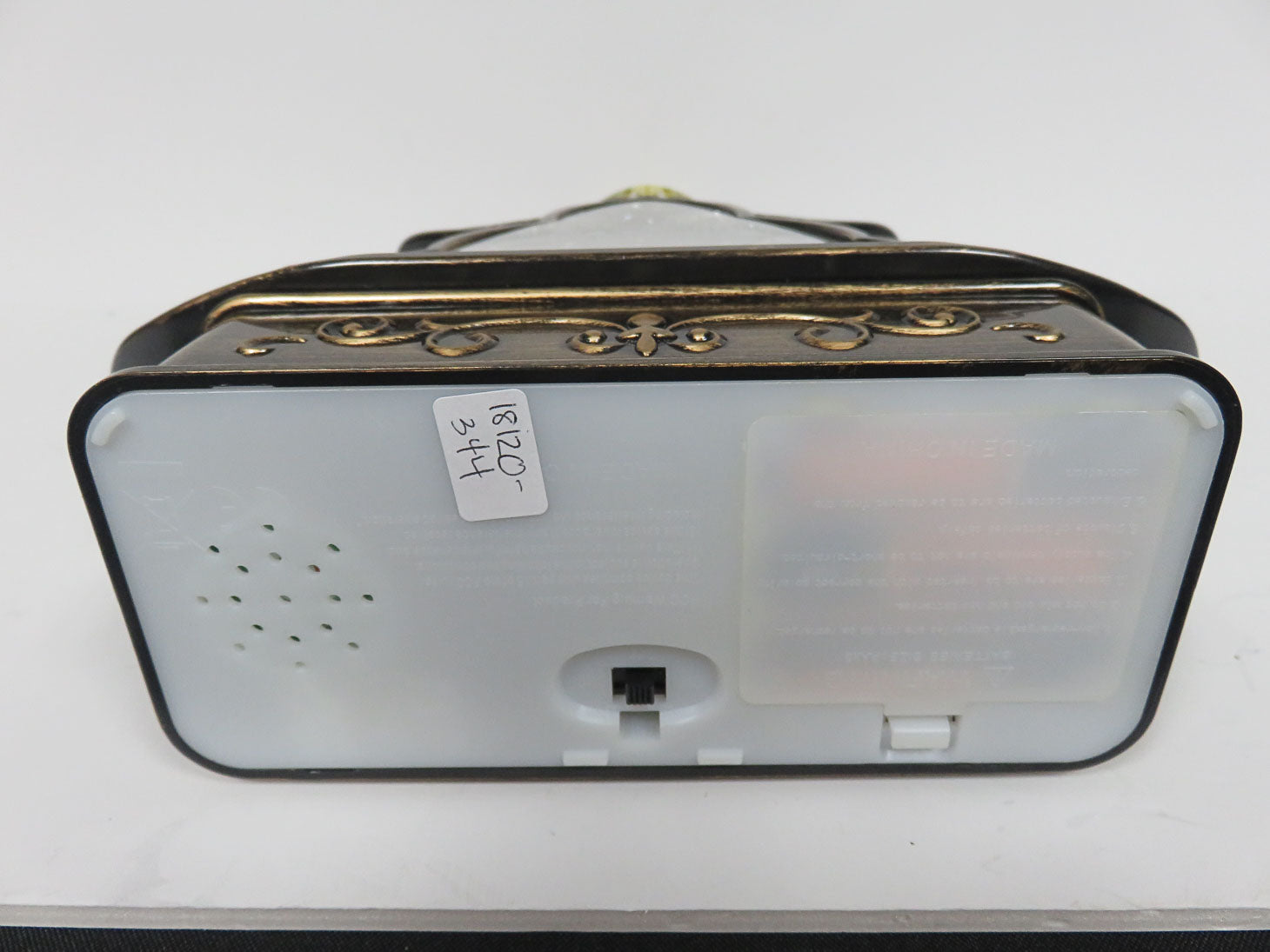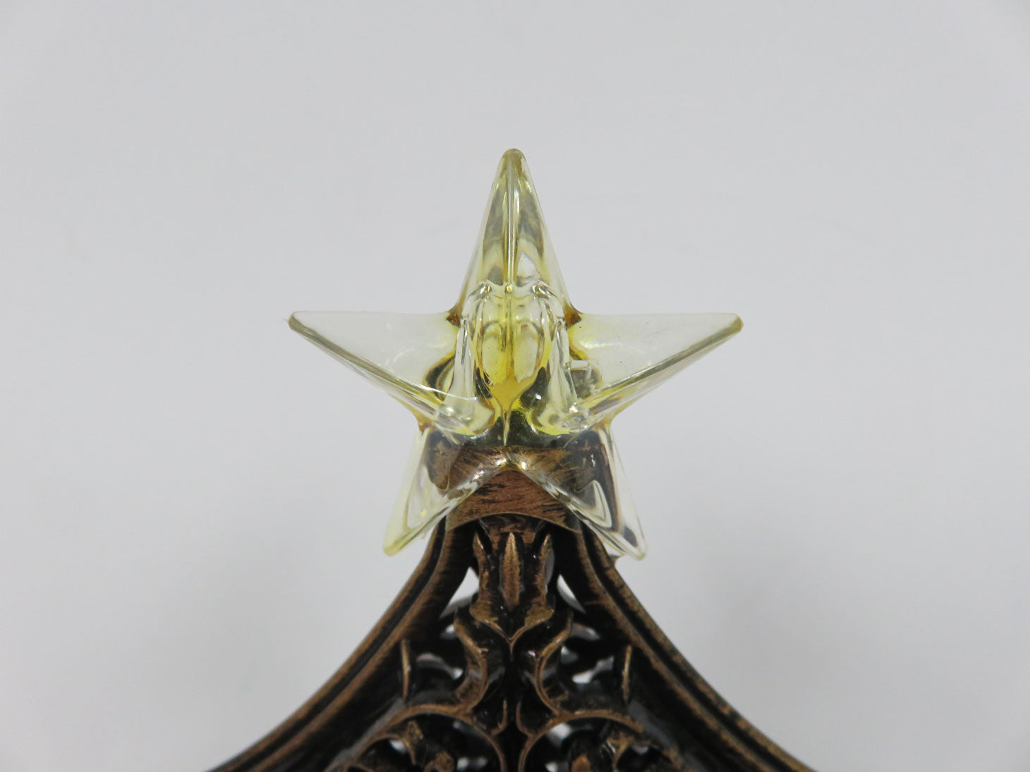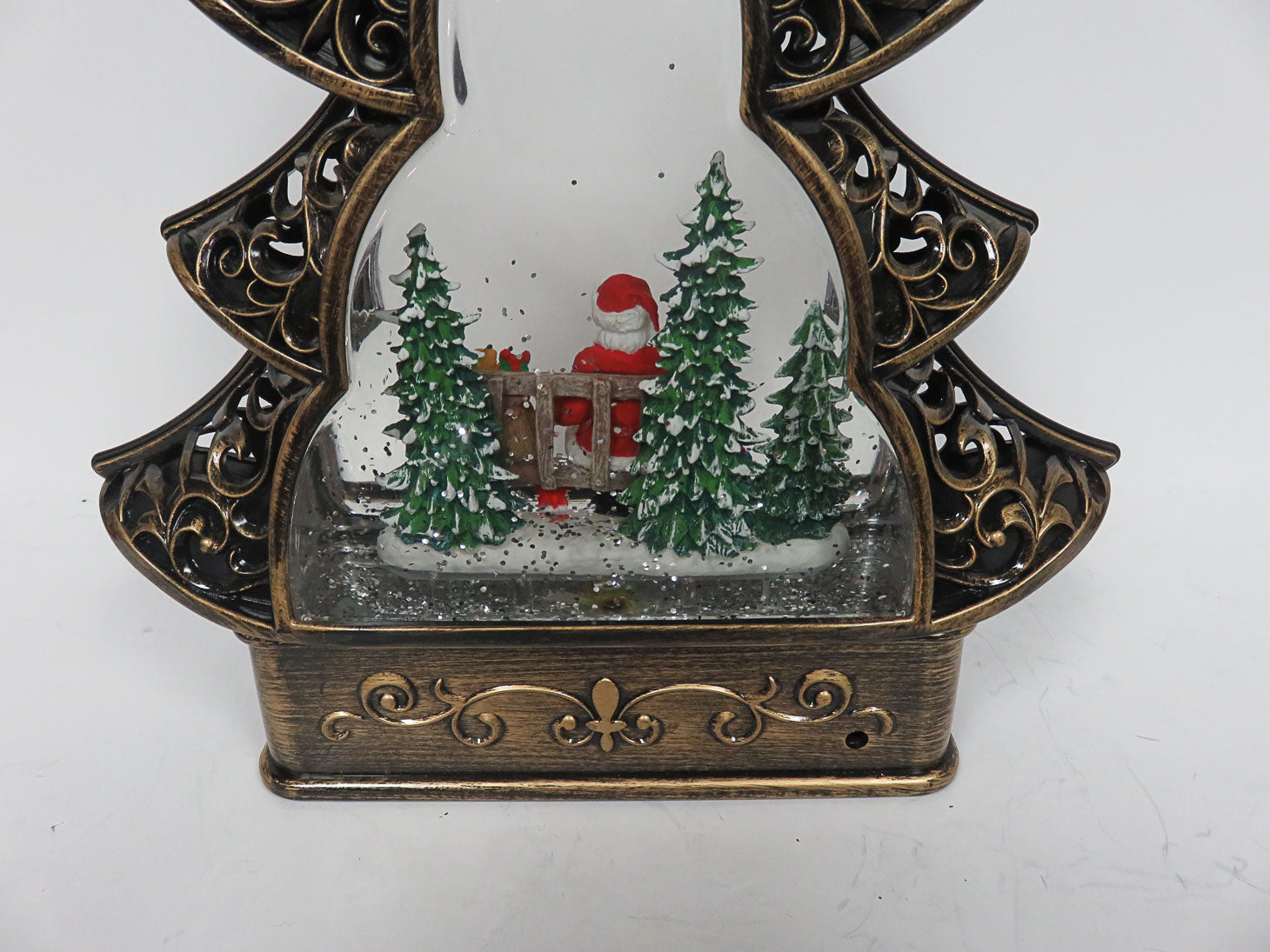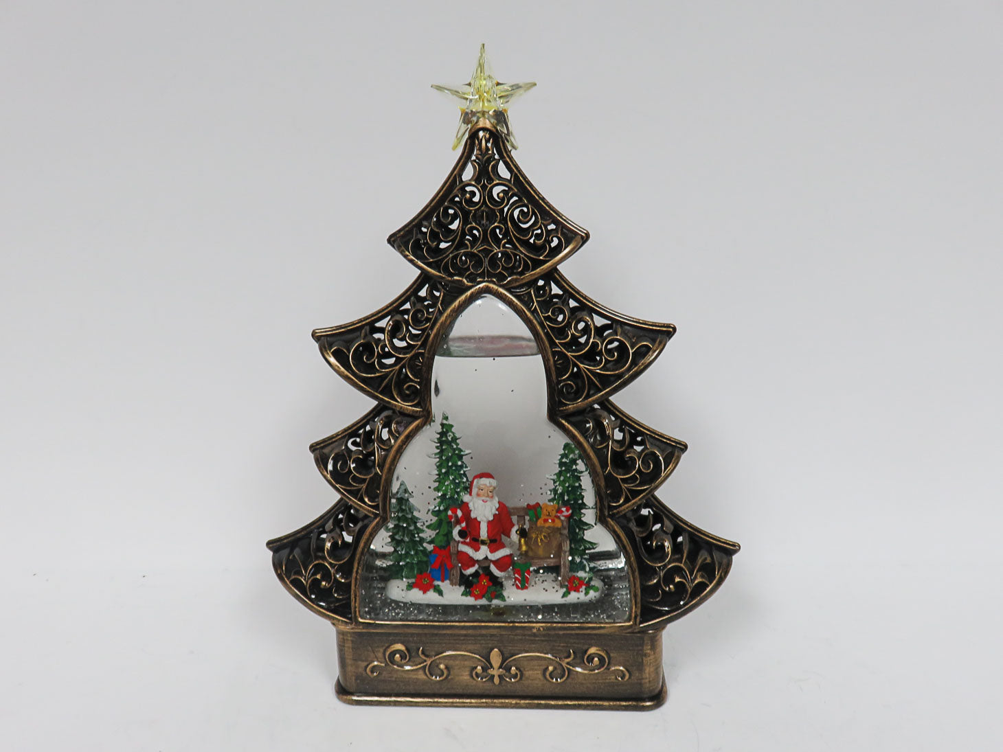 Item Number: 18120-344 Musical snow globe in tree shaped metal frame, Santa sitting on a bench, battery operated. 10"w x 11"h