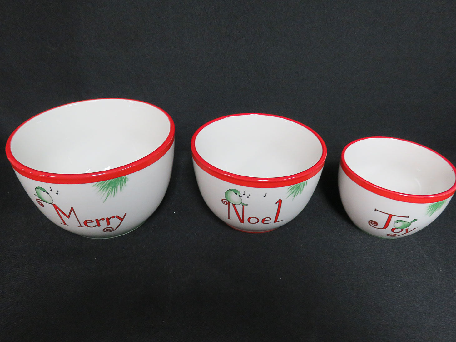 Set of 3, nesting snack bowls, "Merry" "Enjoy" "Noel" white with green birds