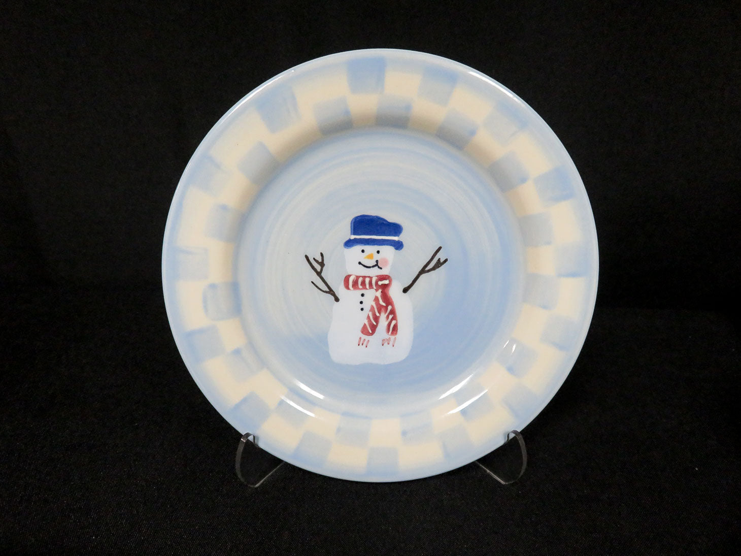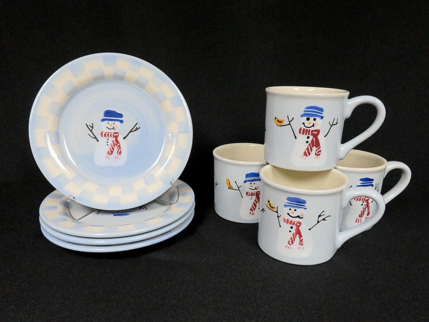 Item Number: 5024-96 Set of 4 each, light blue dessert plates with center snowman, checkerboard trim, snowman mugs (8 pcs) 8"plate 4" x 3.5" mug