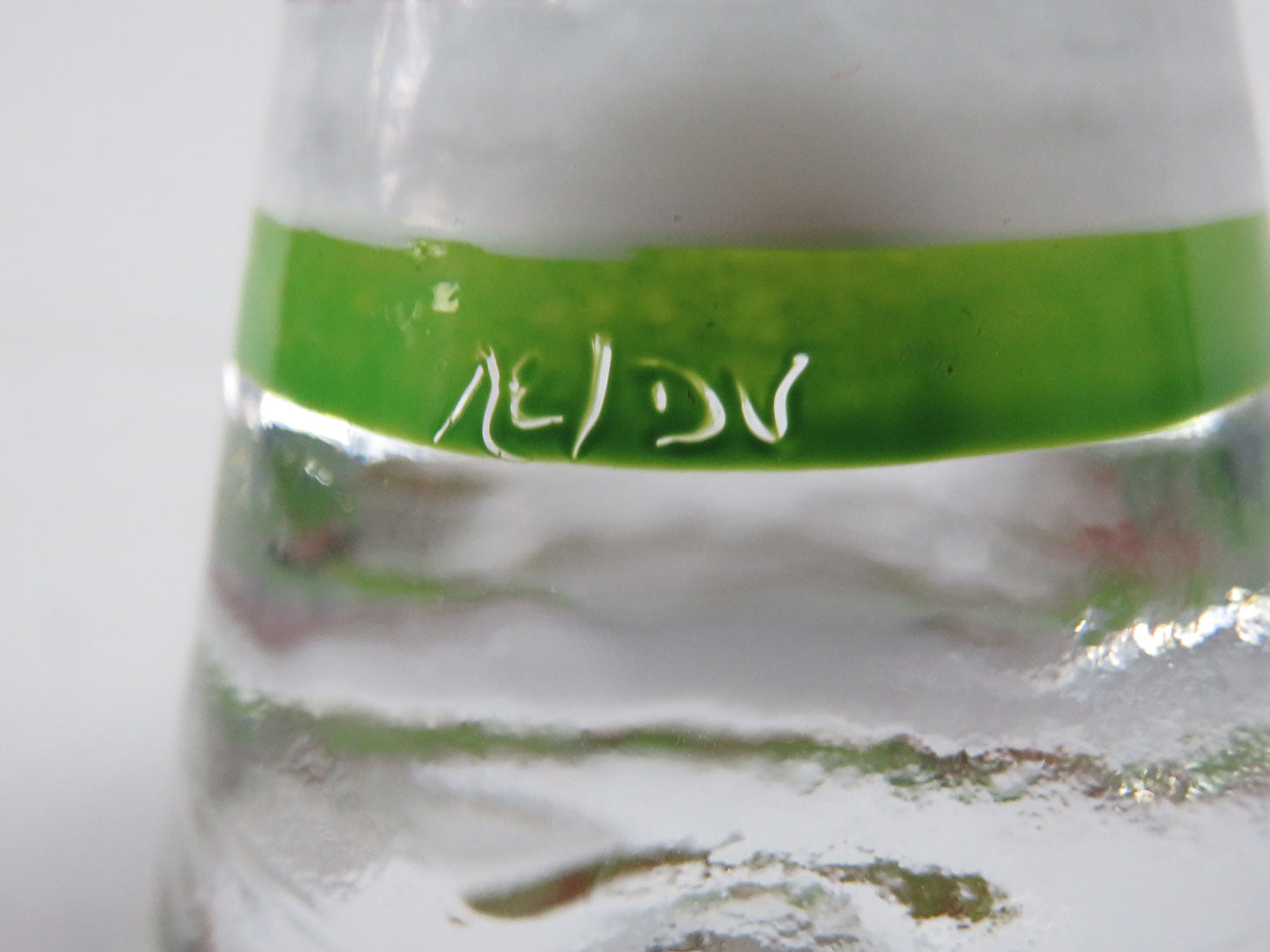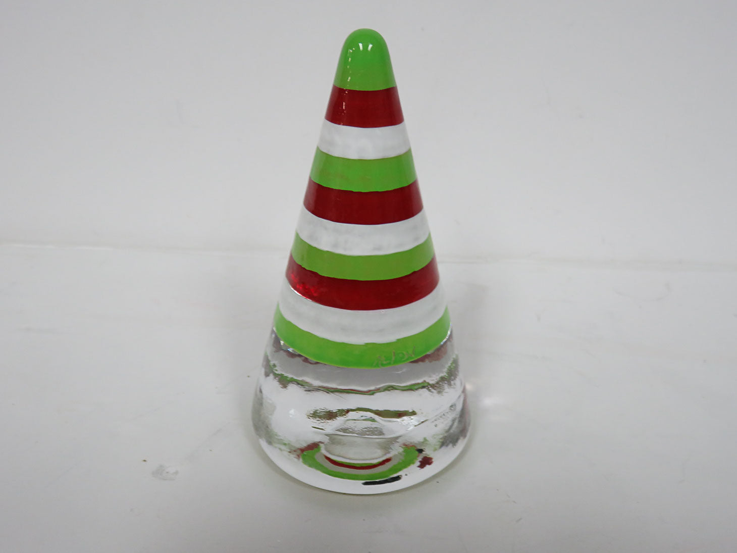 By Anna Ehrner. Cone shaped, red, green and white striped hat, hand painted