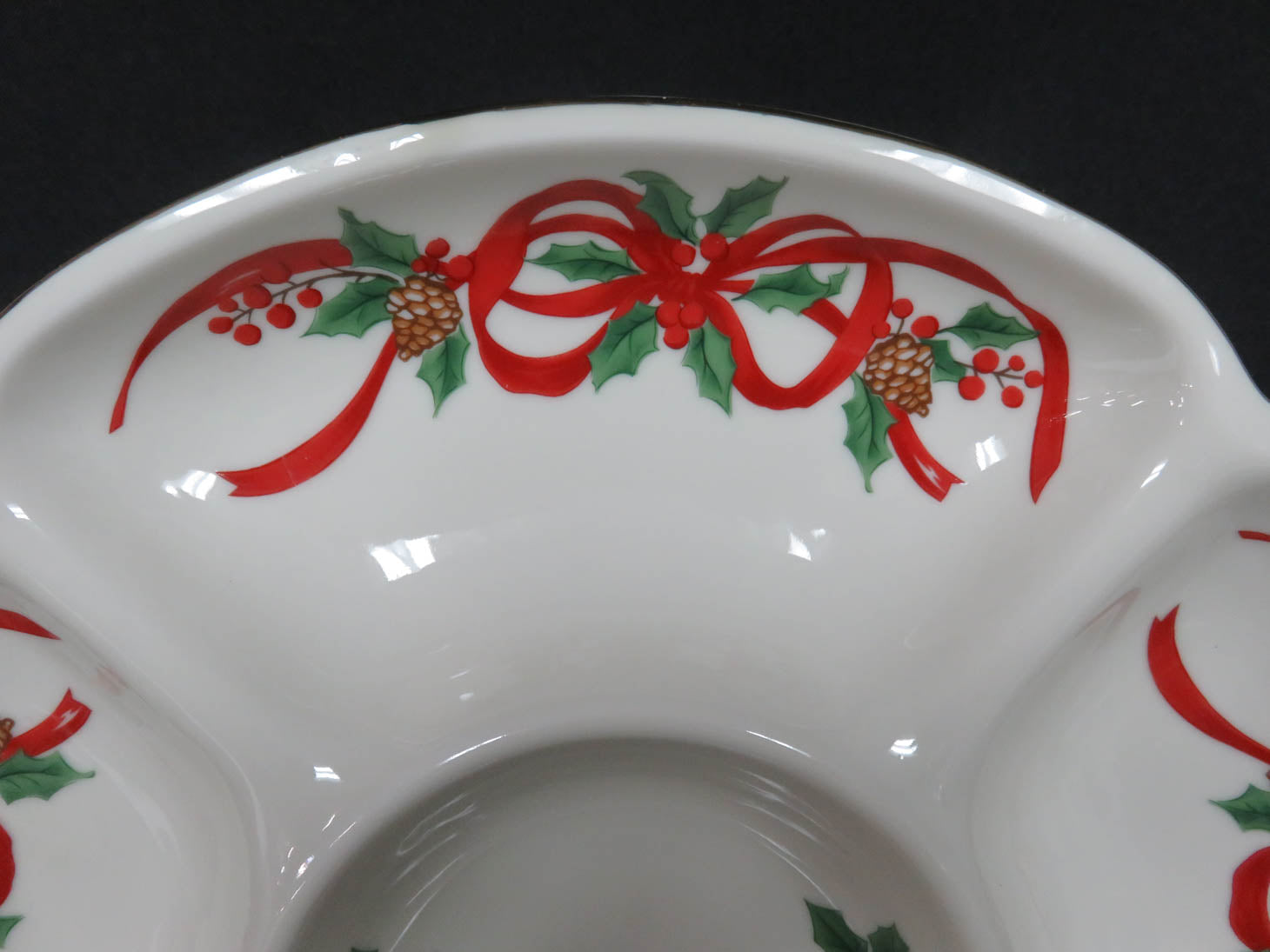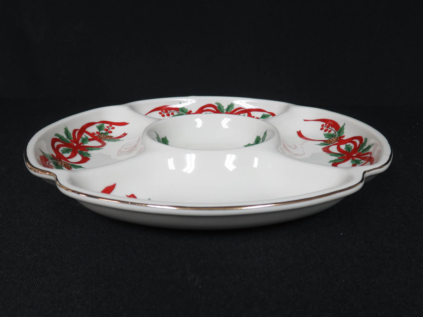 White with red ribbons and holly, gold rim, 5 sections.