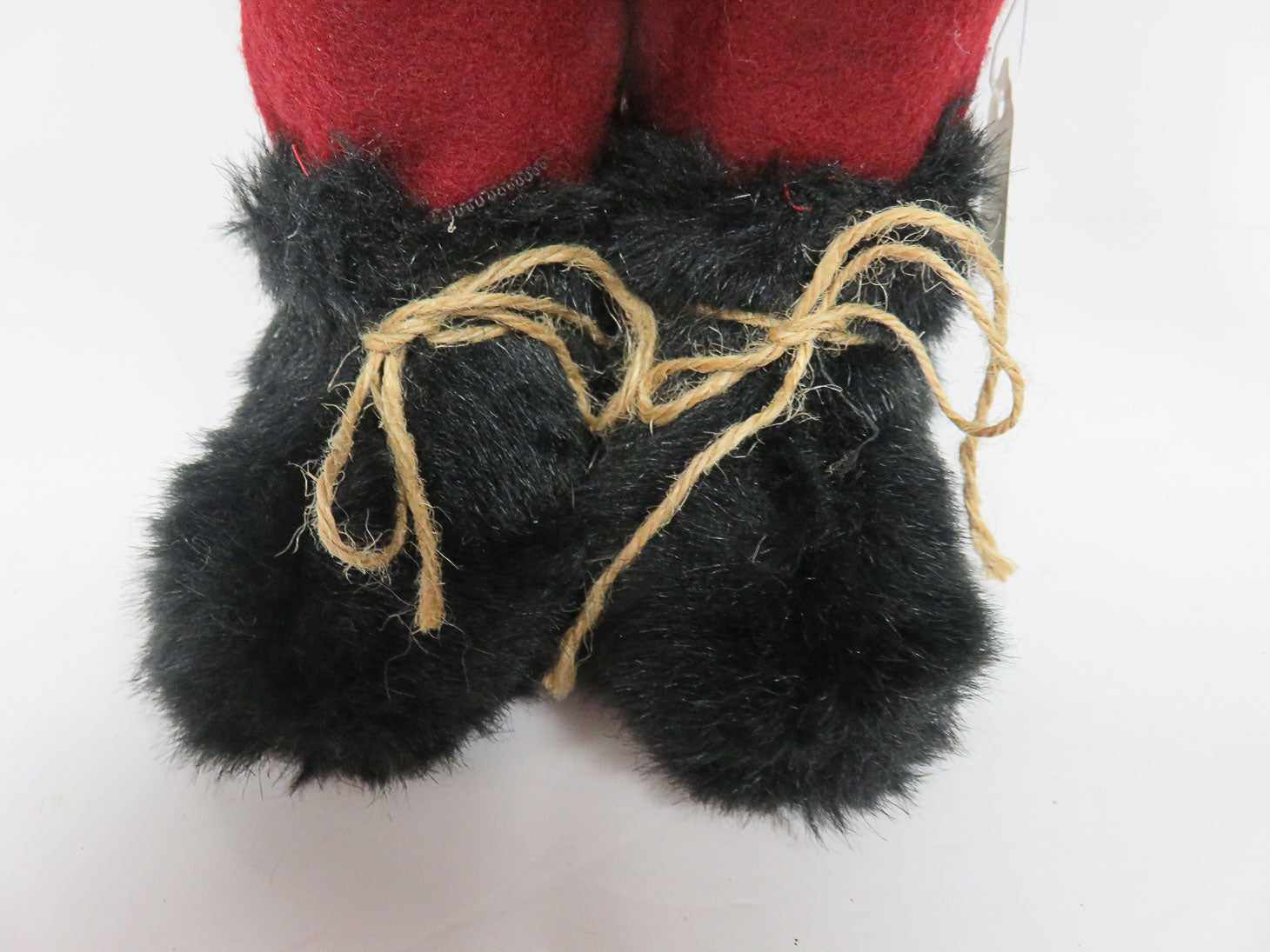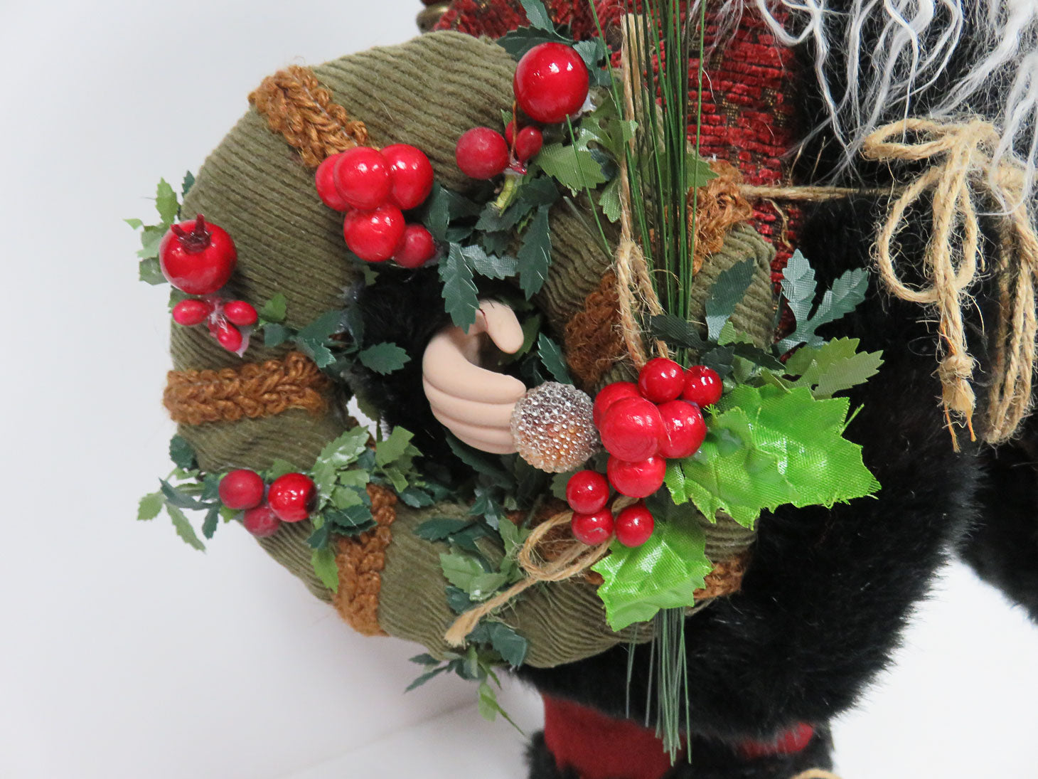 Standing Santa in brocade coat with black fur, holding a wreath and sack, wearing fur boots
