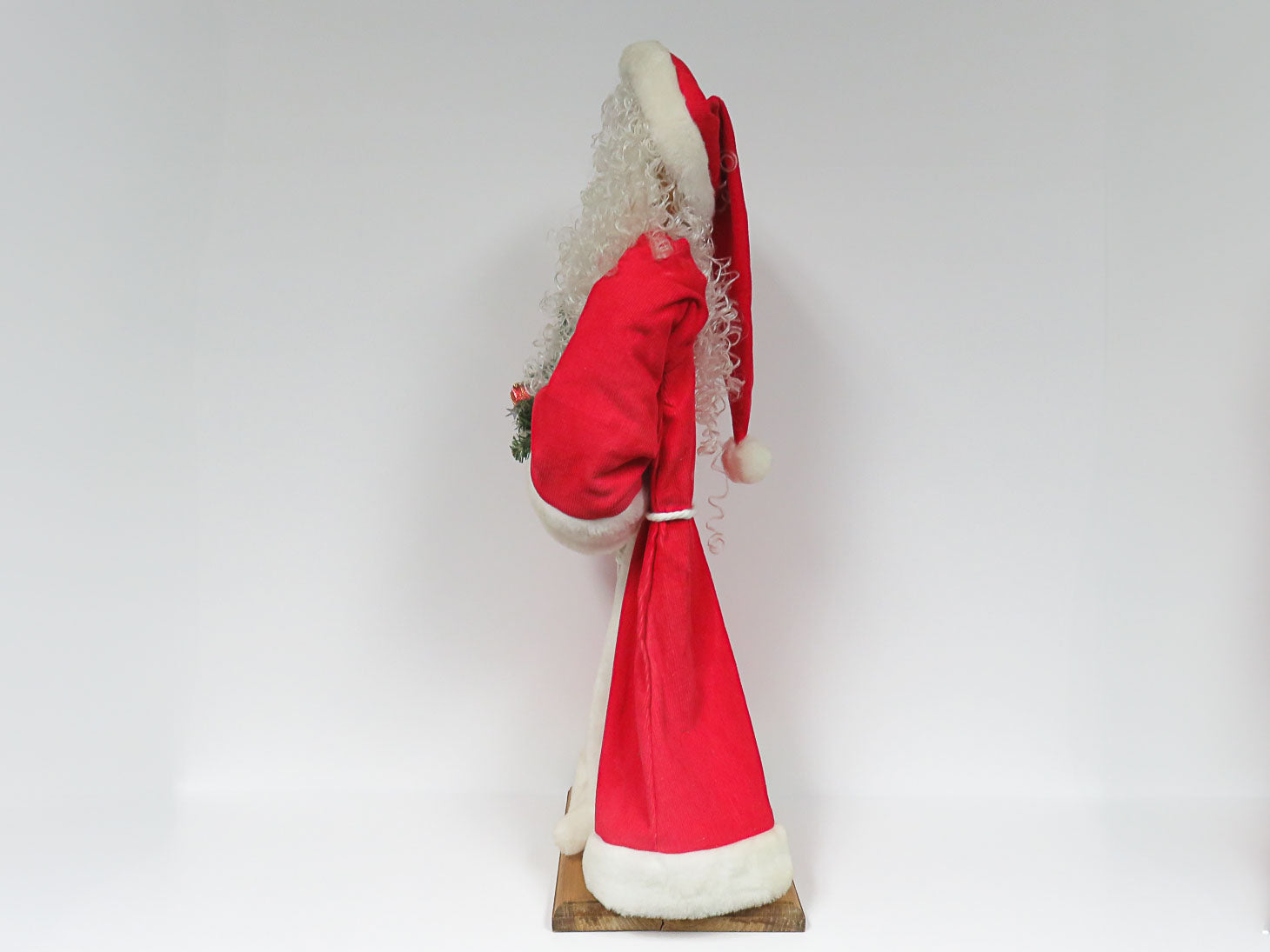 Red fur lined coat, holding a tree, curly beard, wood base