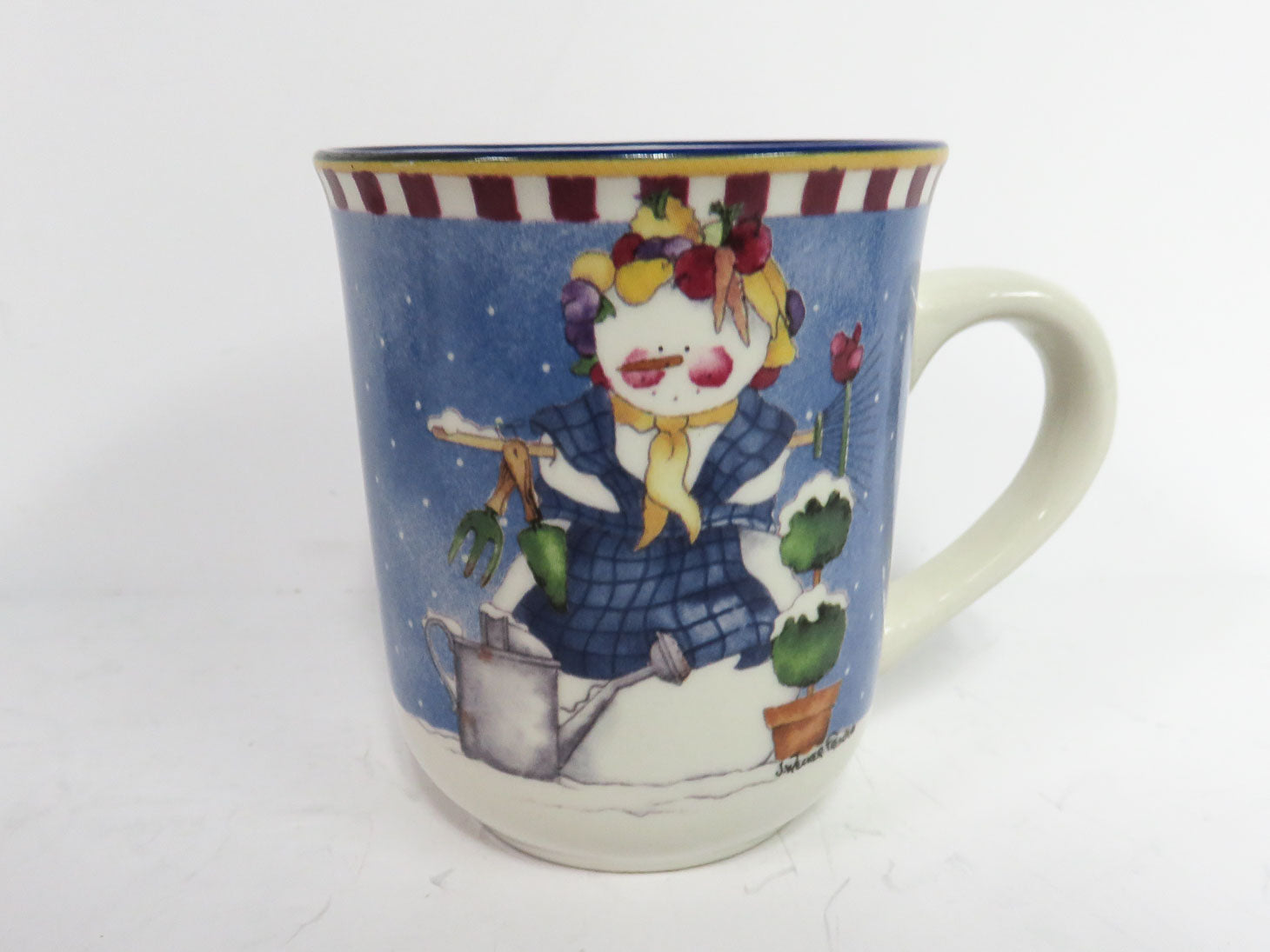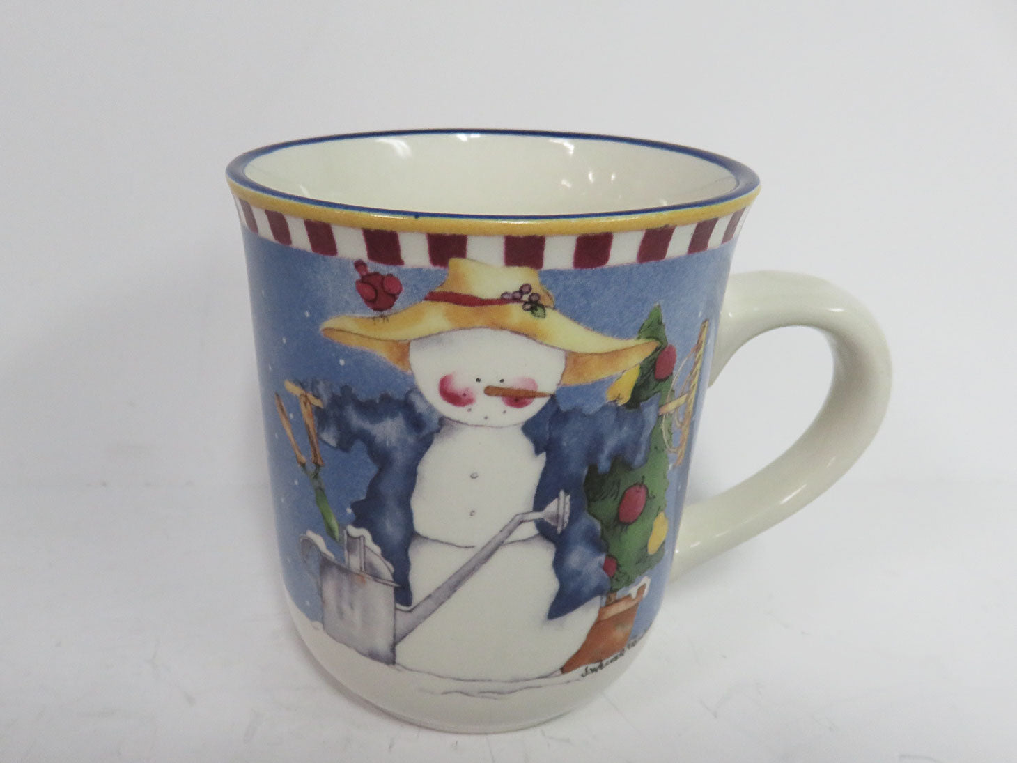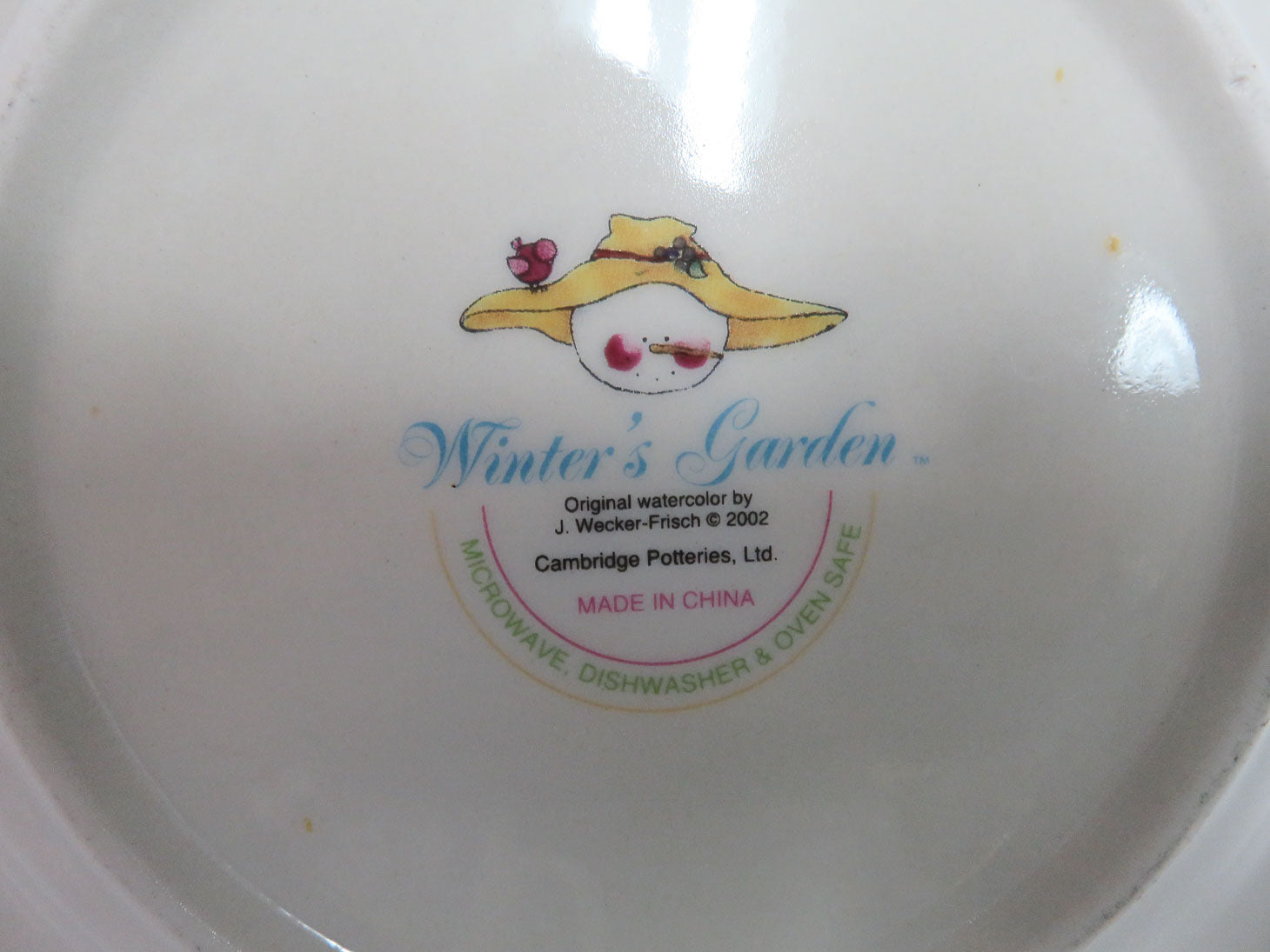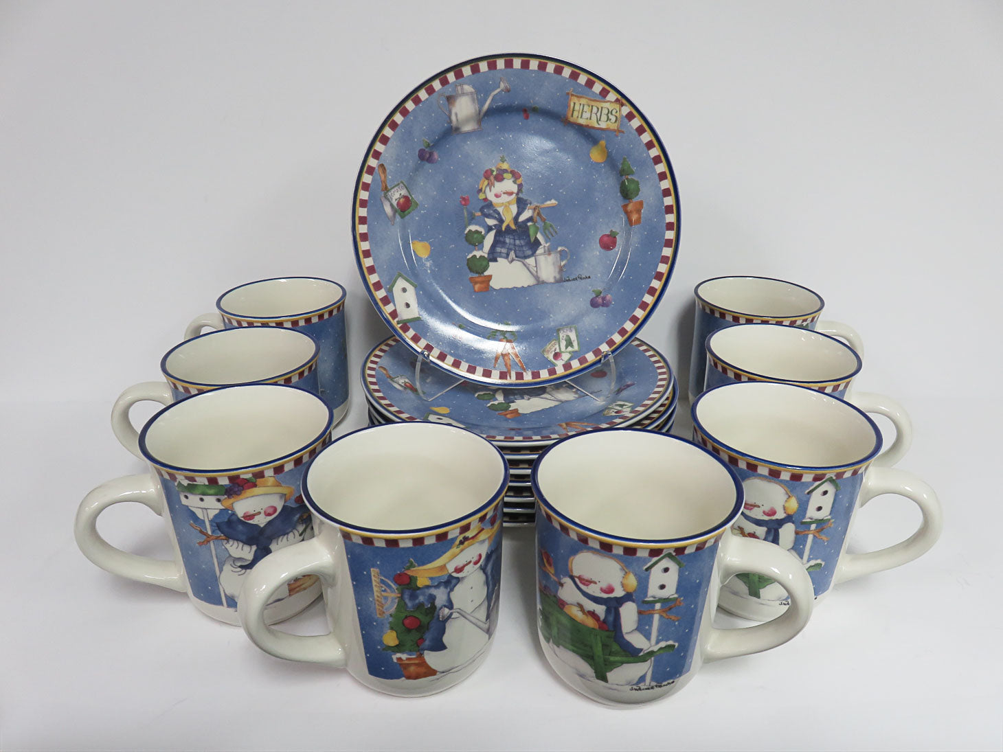Set of 8 mugs and plates. Whimsical with various snowman designs in center.