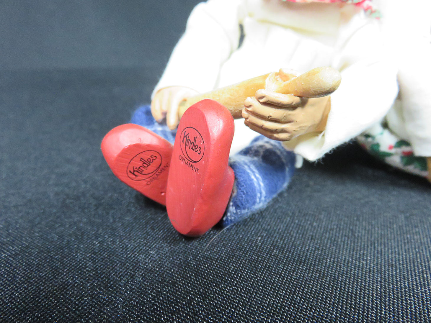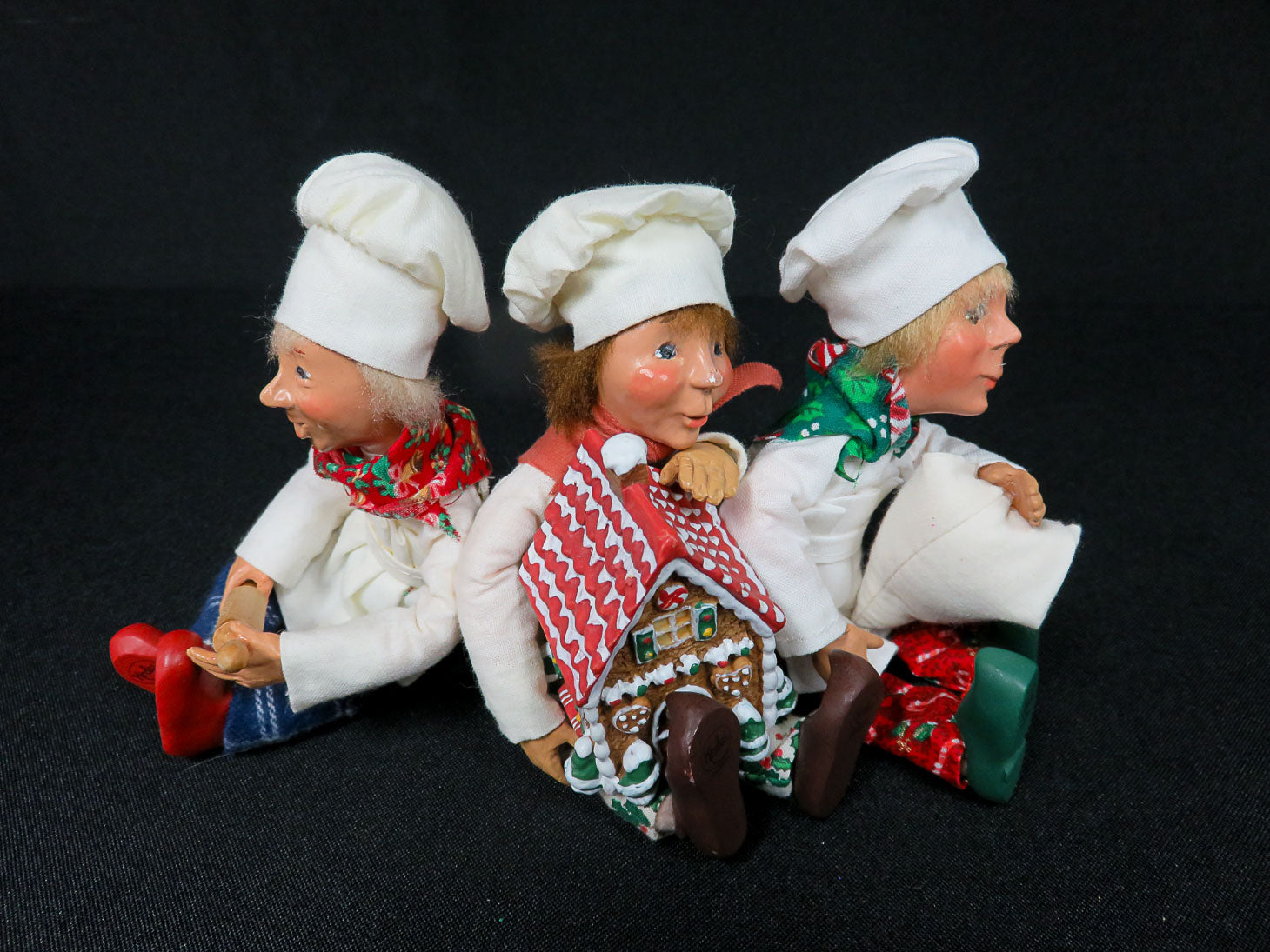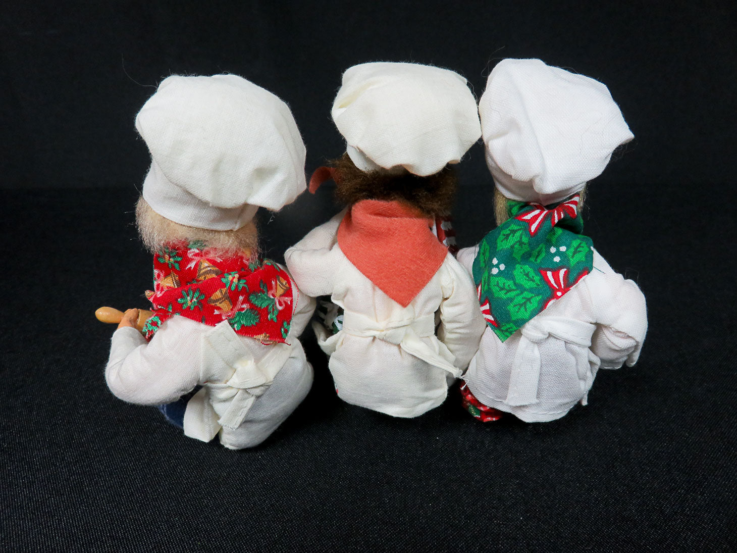 Set of 3, Kindles with chef hats holding gingerbread house, rolling pin and flour sack.