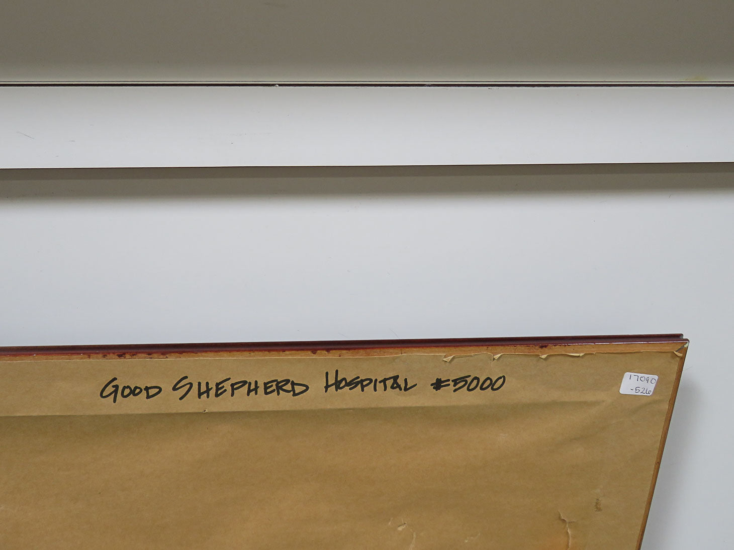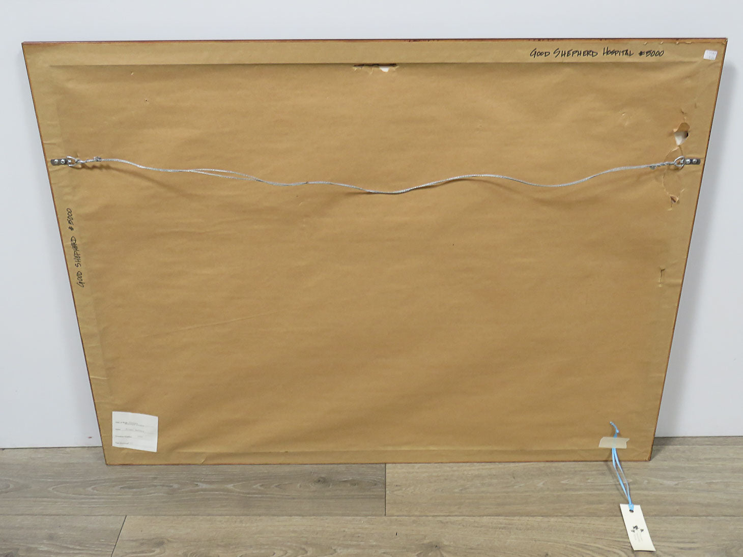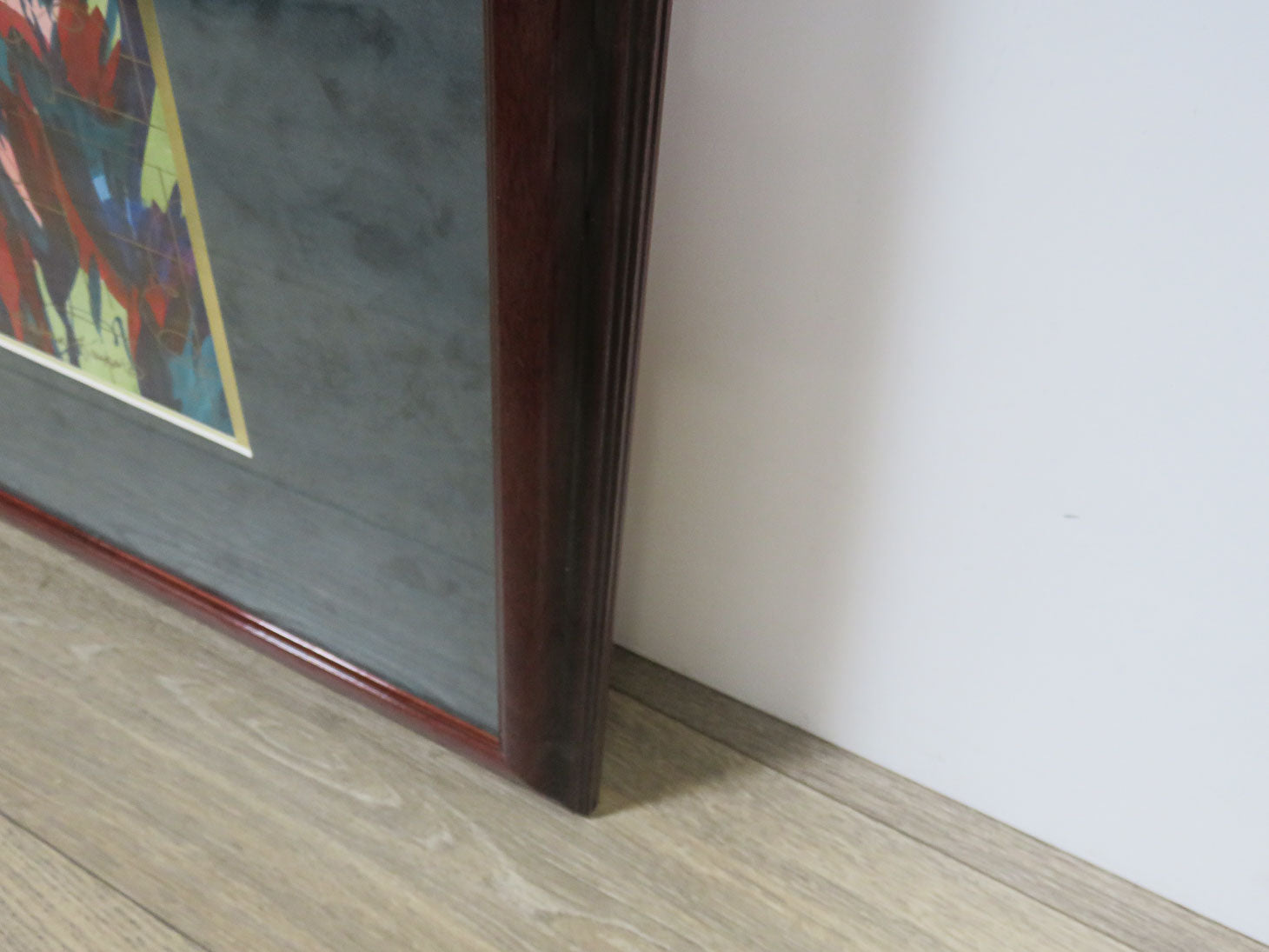 Large lakeside floral accented in gold foil. Double mat in rosewood lacquered frame.