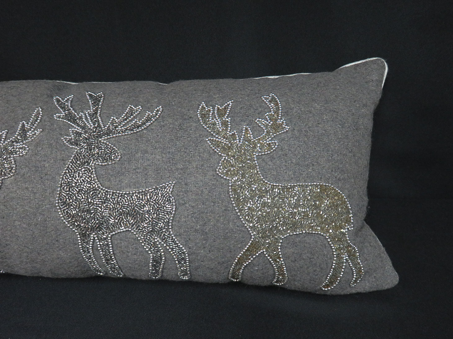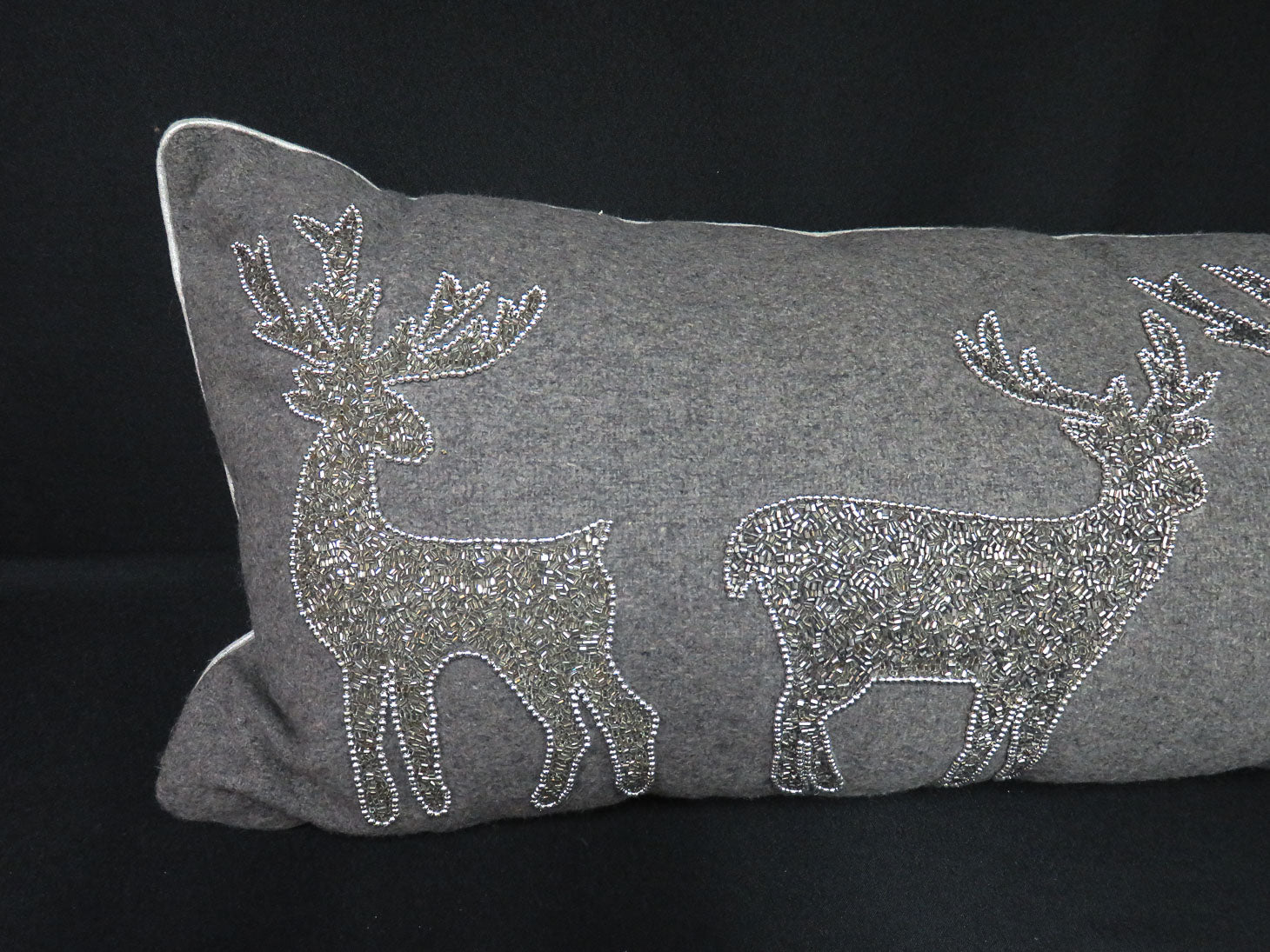 Item Number: 28131-15 Gray felt with sequin reindeer and silver toned piping, zippered, poly filled 34" x 5" x 14"