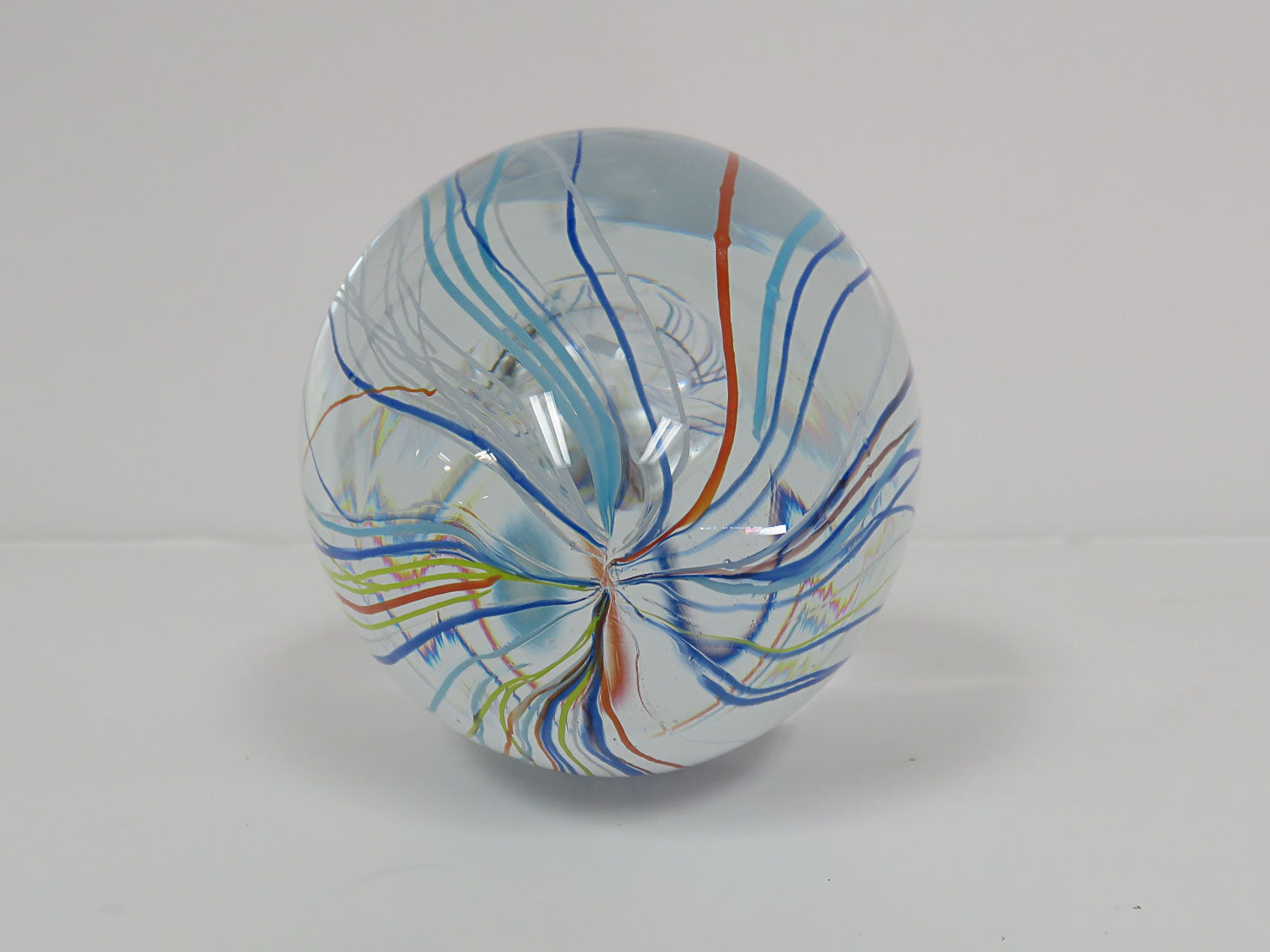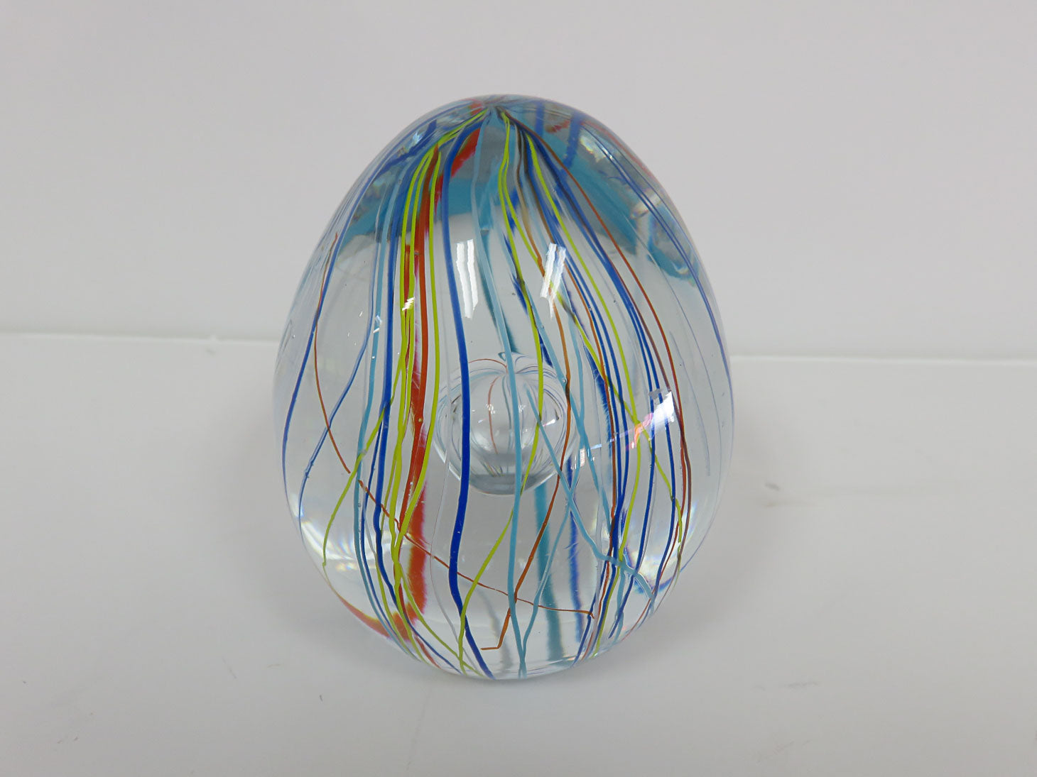 Egg shaped, clear with multicolored stripes and interior center bubble.