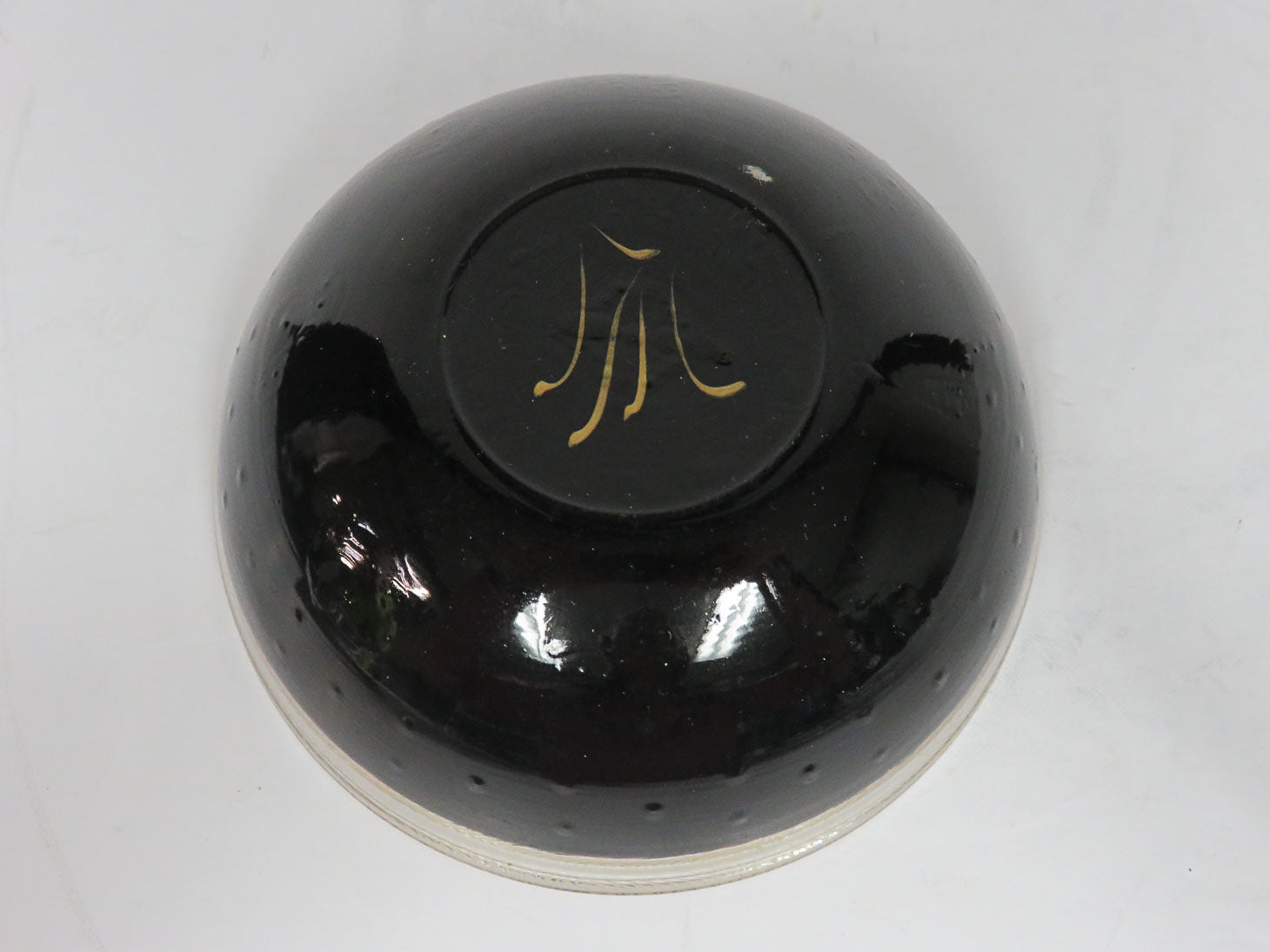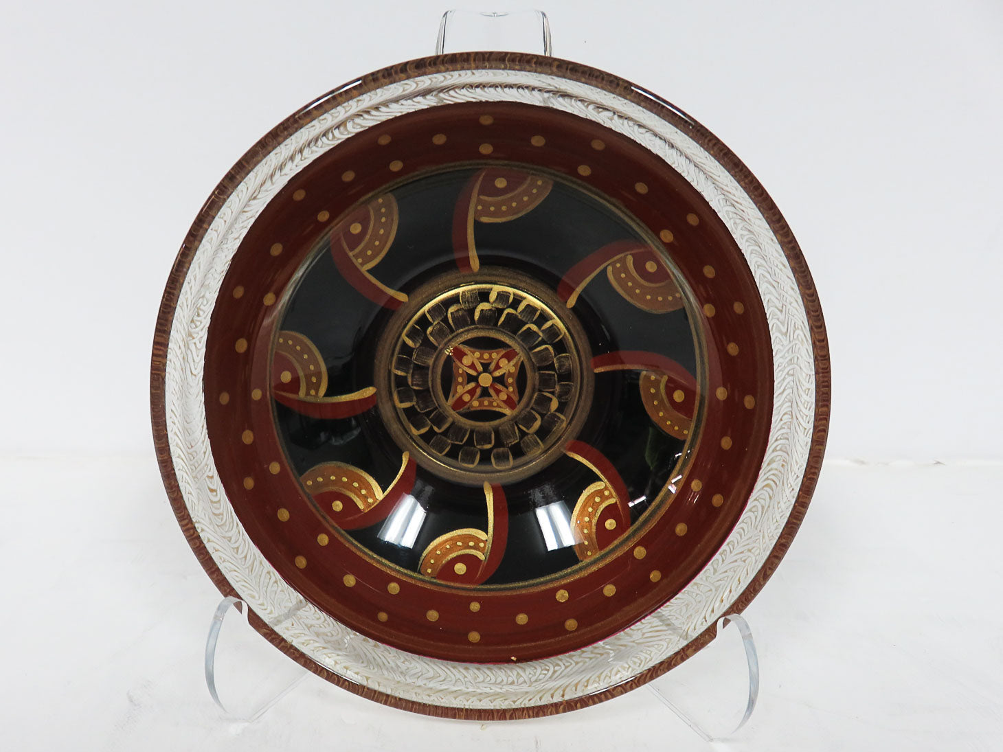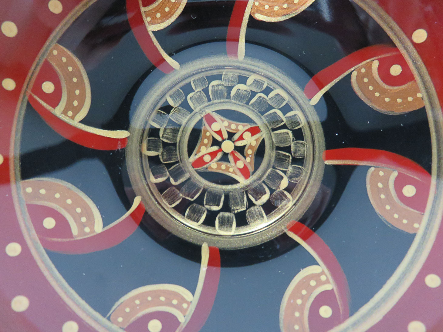 By Susan Schmidt, one of a kind, hand-painted, gold chevron edge, red with gold dot band, black and gold brush stroke center