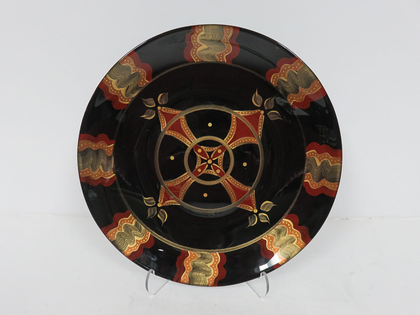 By Susan Schmidt, one of a kind, hand-painted, black with red and gold cross and gold rings 9.5" W