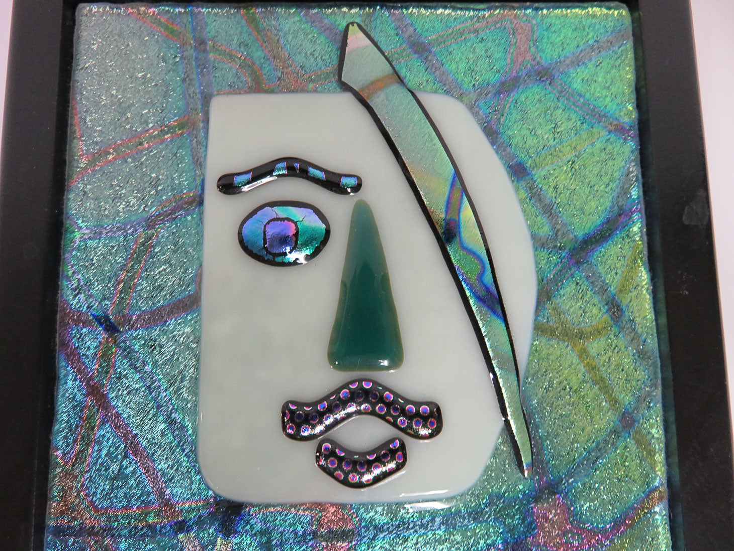 "Ellen Gomberg", hinged box, fused glass face, iridescent green and blue