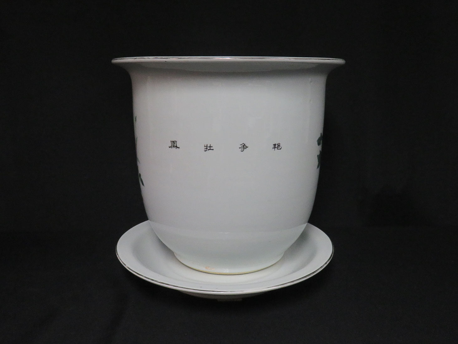 Chinese planter with peacocks, pink and blue large peonie . White with silver trim. Wear consistent with age.