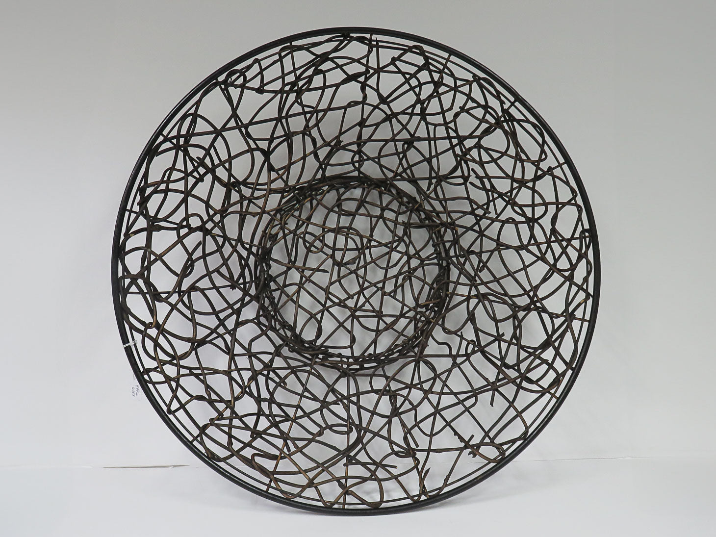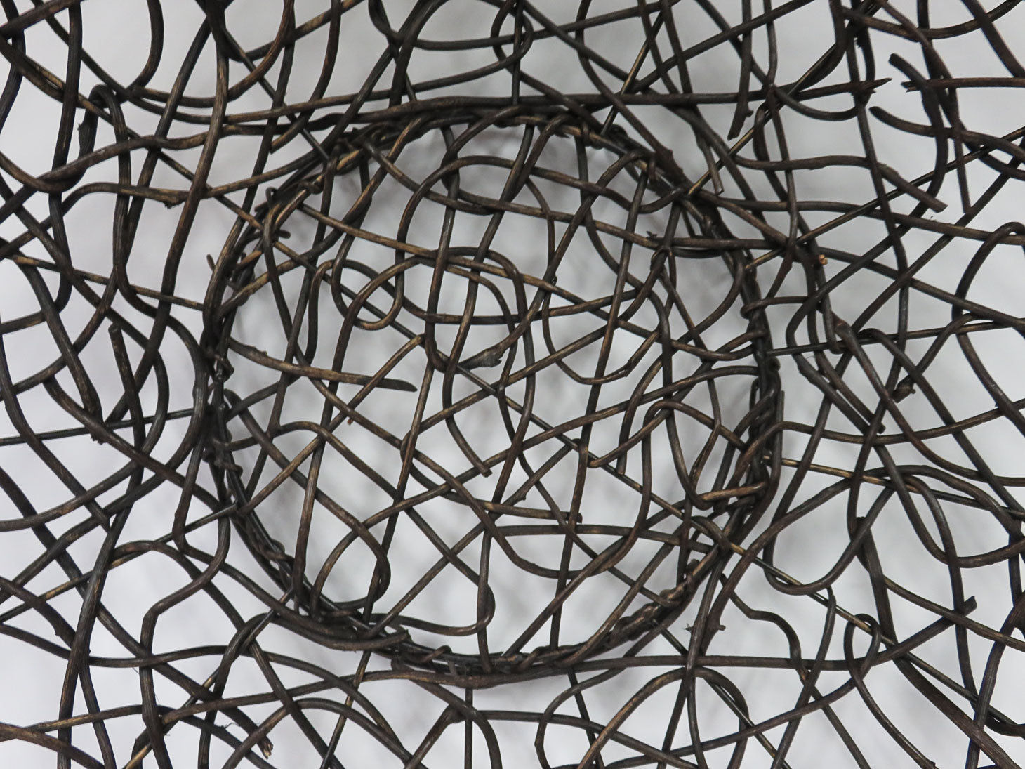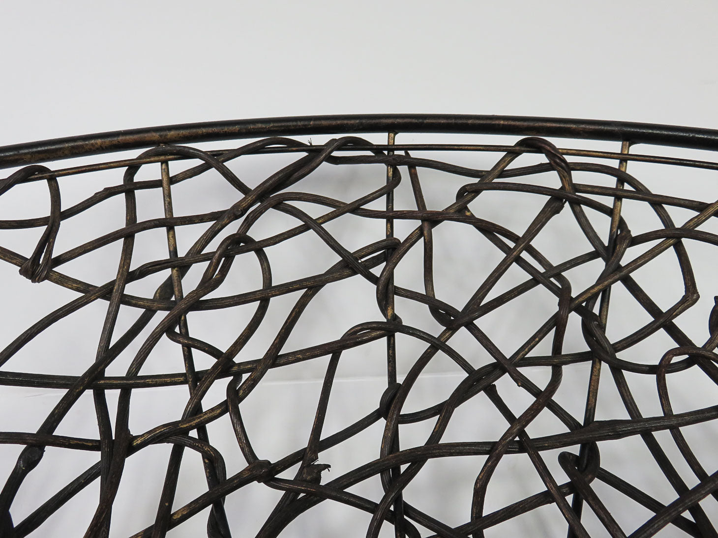 Round open weave branch basket on a pedestal base, some broken twigs