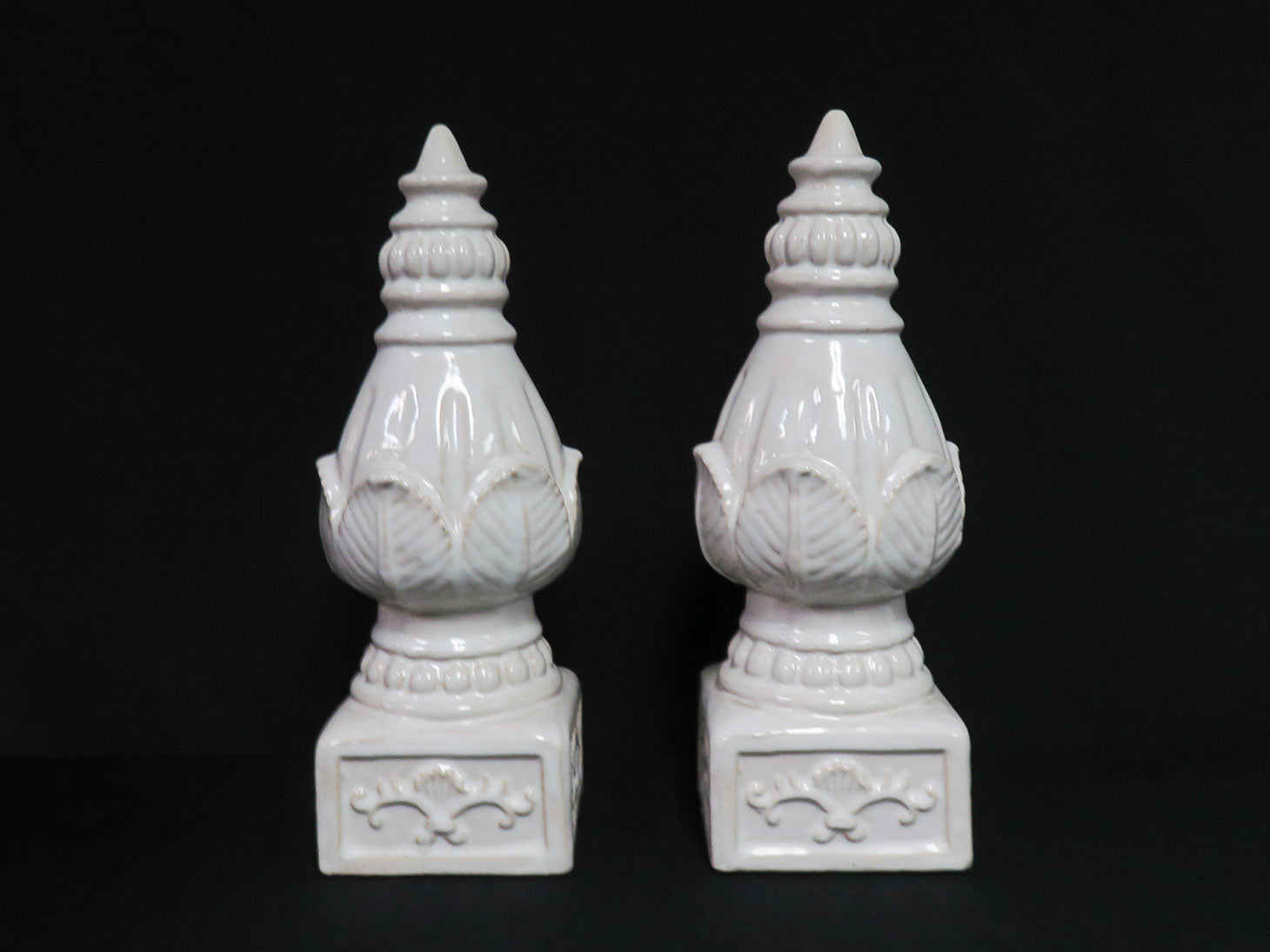 Item Number: 22085-54 Pair of whitewashed finials on square base with leaf design. Tiny crack on base. 5" x 5" x 13"