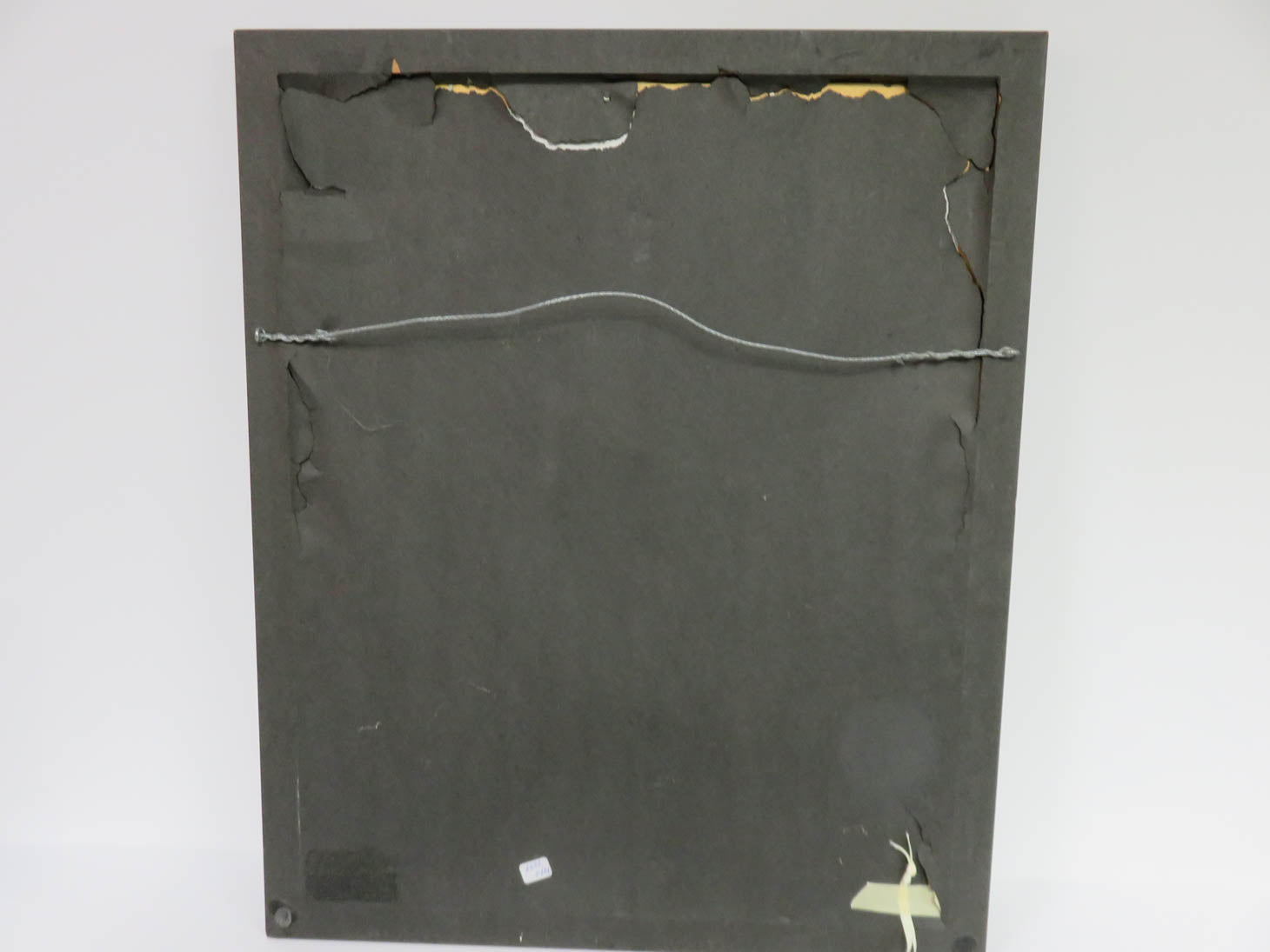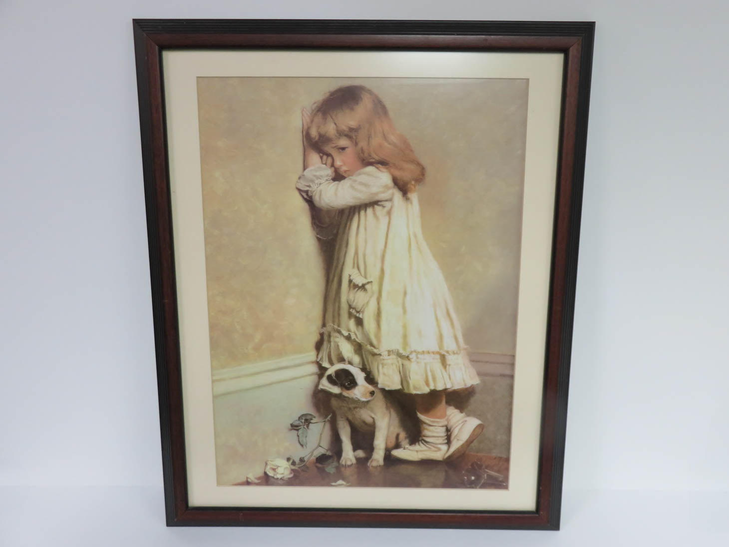 Crying young girl in white dress standing in a corner; Brown frame