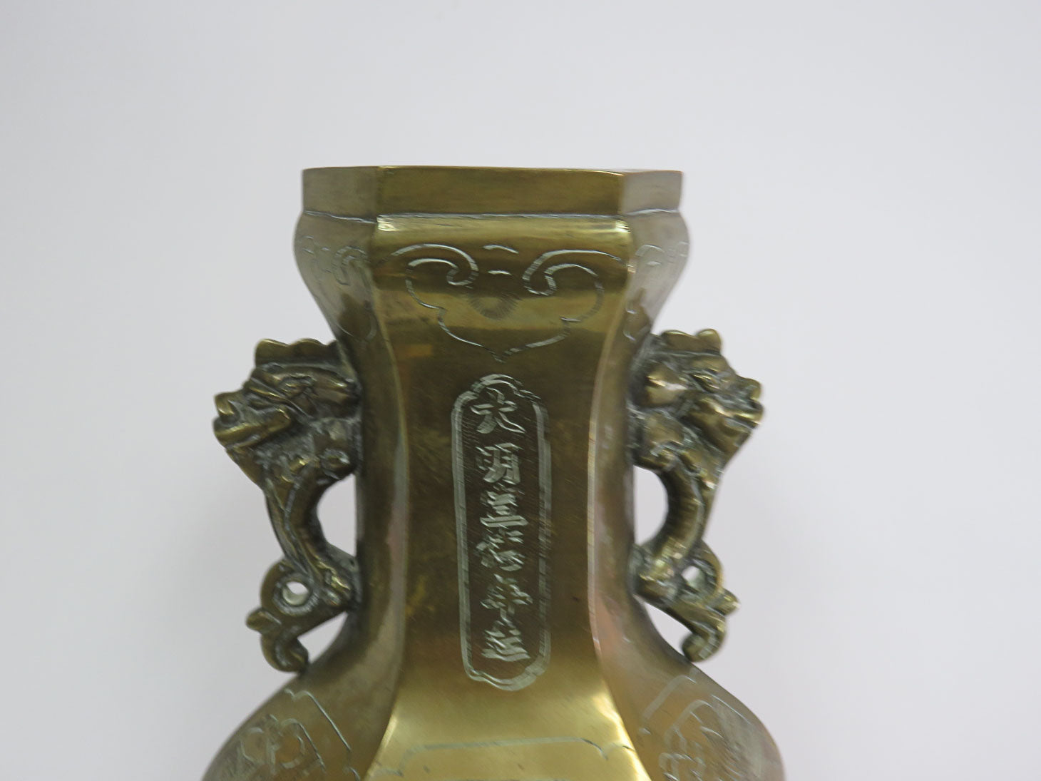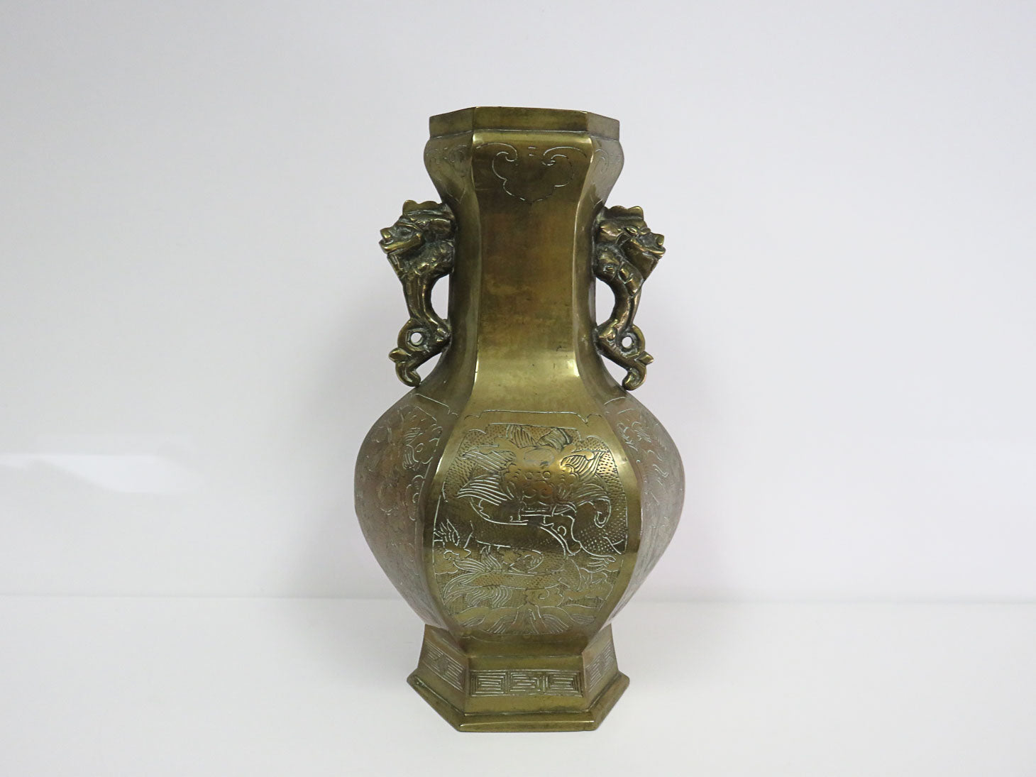 Asian engraved designs, hexagonal body, narrow neck with stylized dragon handles
