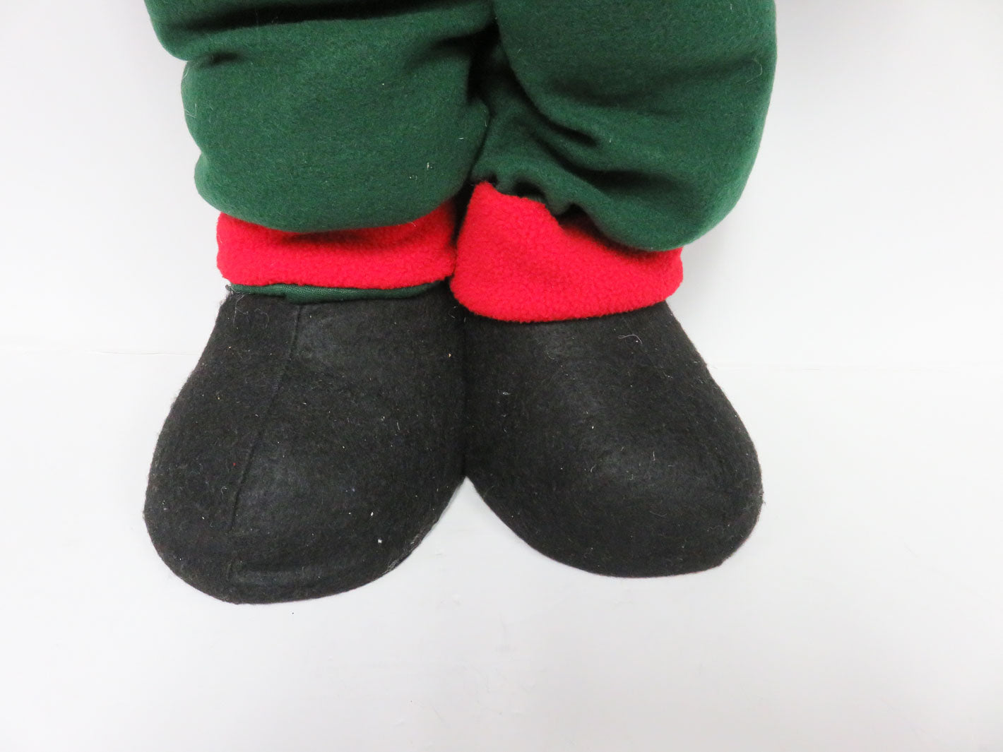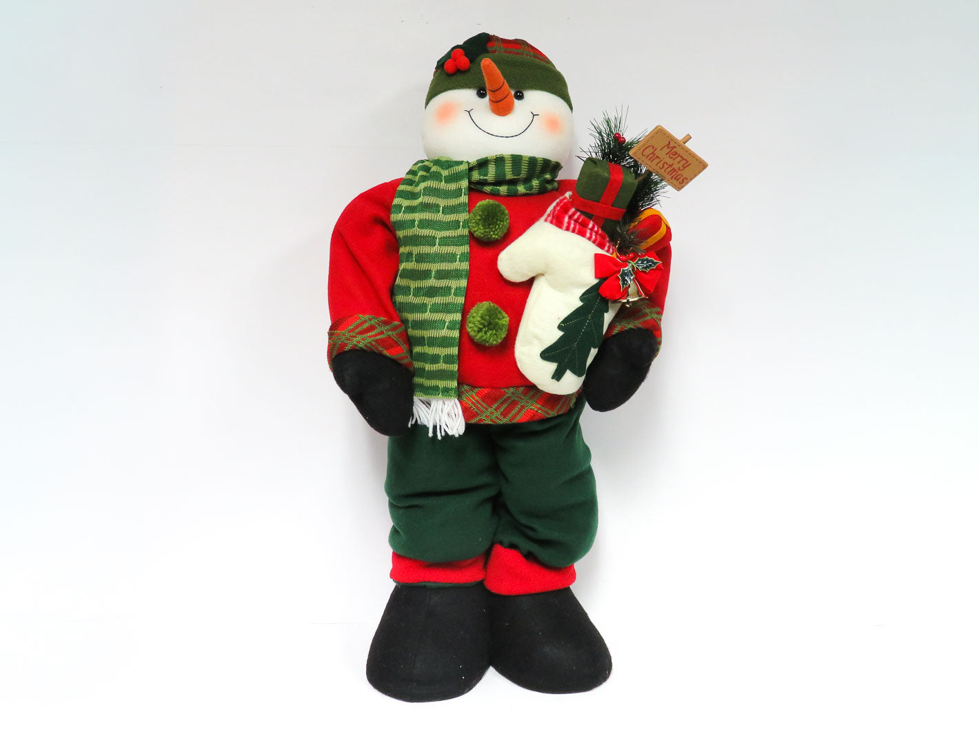 Tall, adjustable snowman wearing green pants & red jacket. Holding a mitten full of presents.