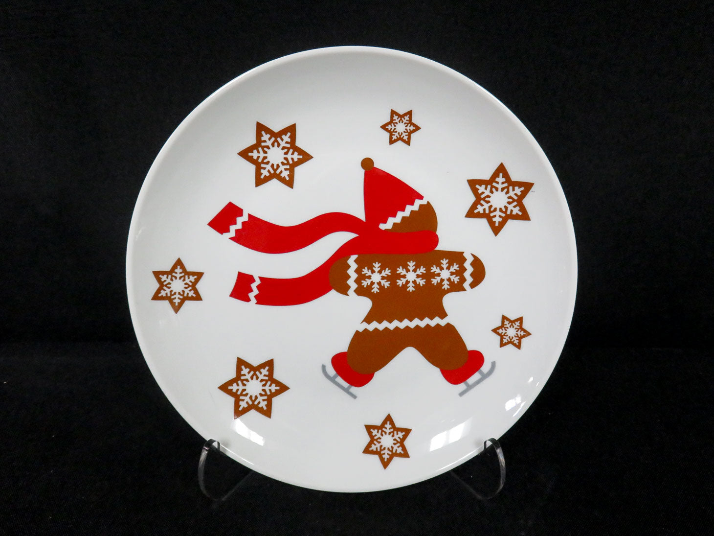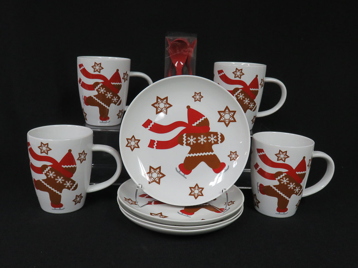 9 pcs, White plates with ice skating gingerbread man, red scarf and snowflakes, 4 plates, 4 mugs, box with spoons, never used 7" plate, 4-1/2" mug