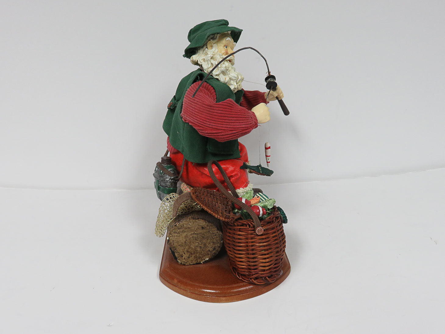 Santa seated on log with basket of fish and rod on wood base