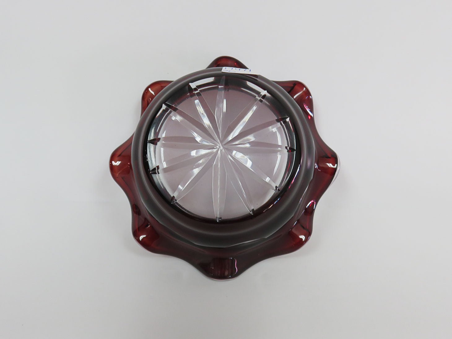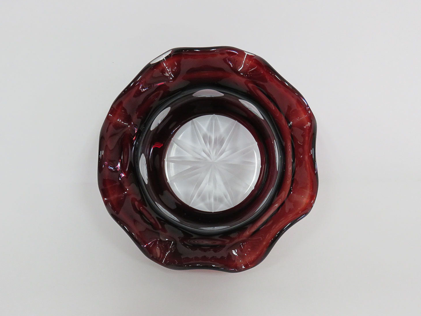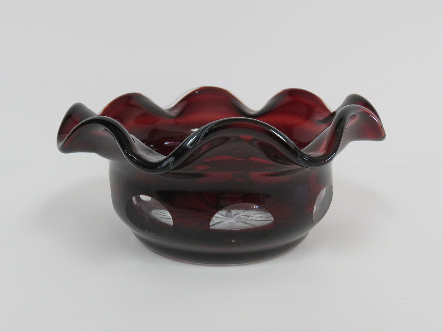 Cranberry with cut to clear circles, thumbprint ruffled edge, starburst bottom