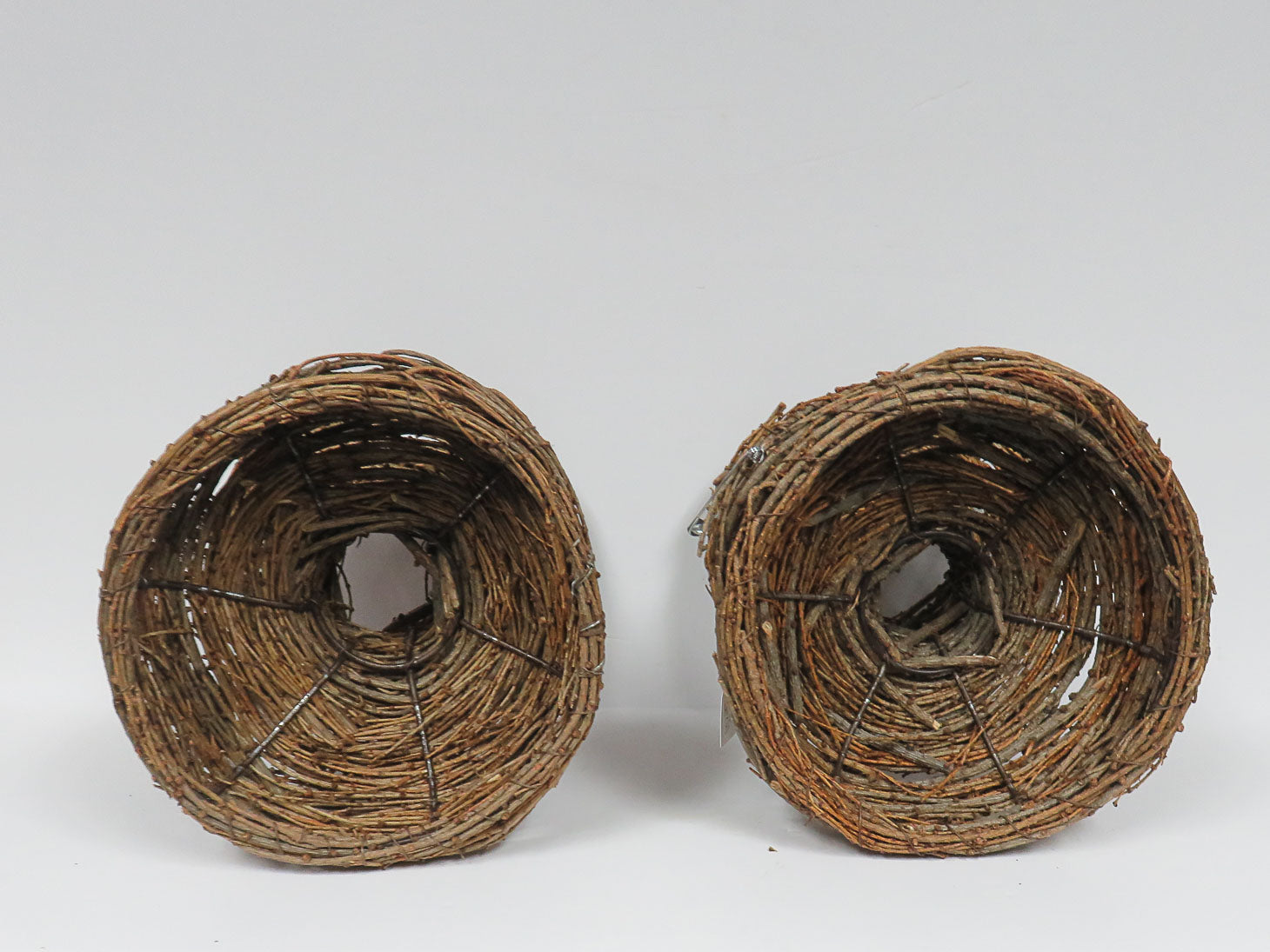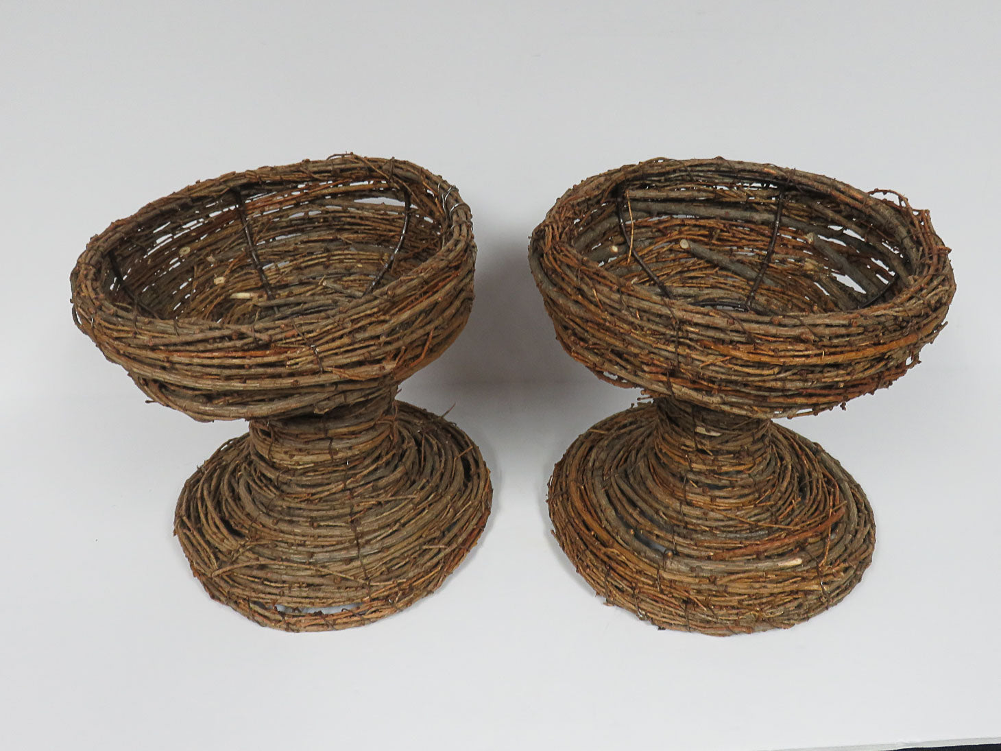 Set of 2, woven twig vessels wrapped around a metal frame.