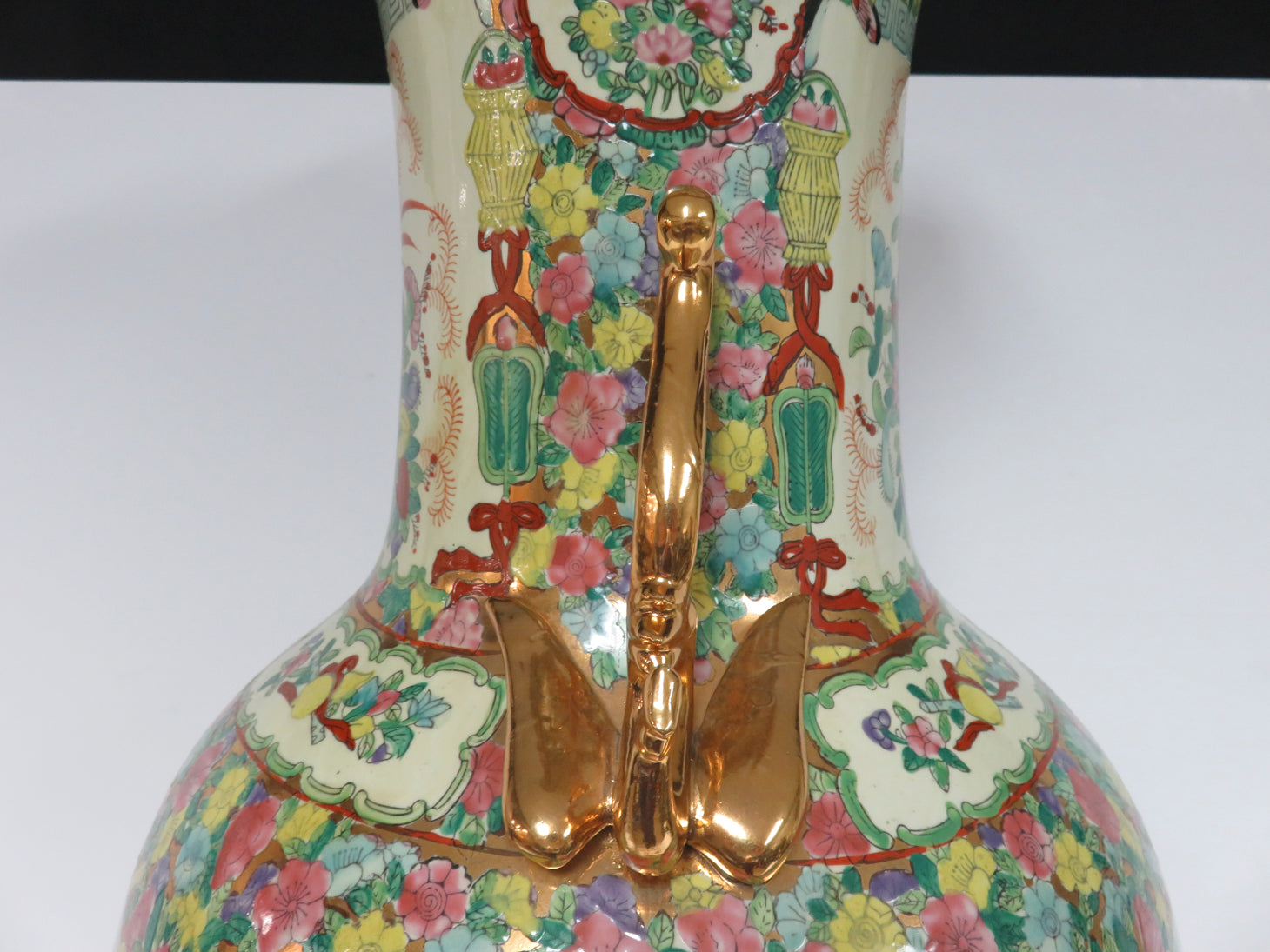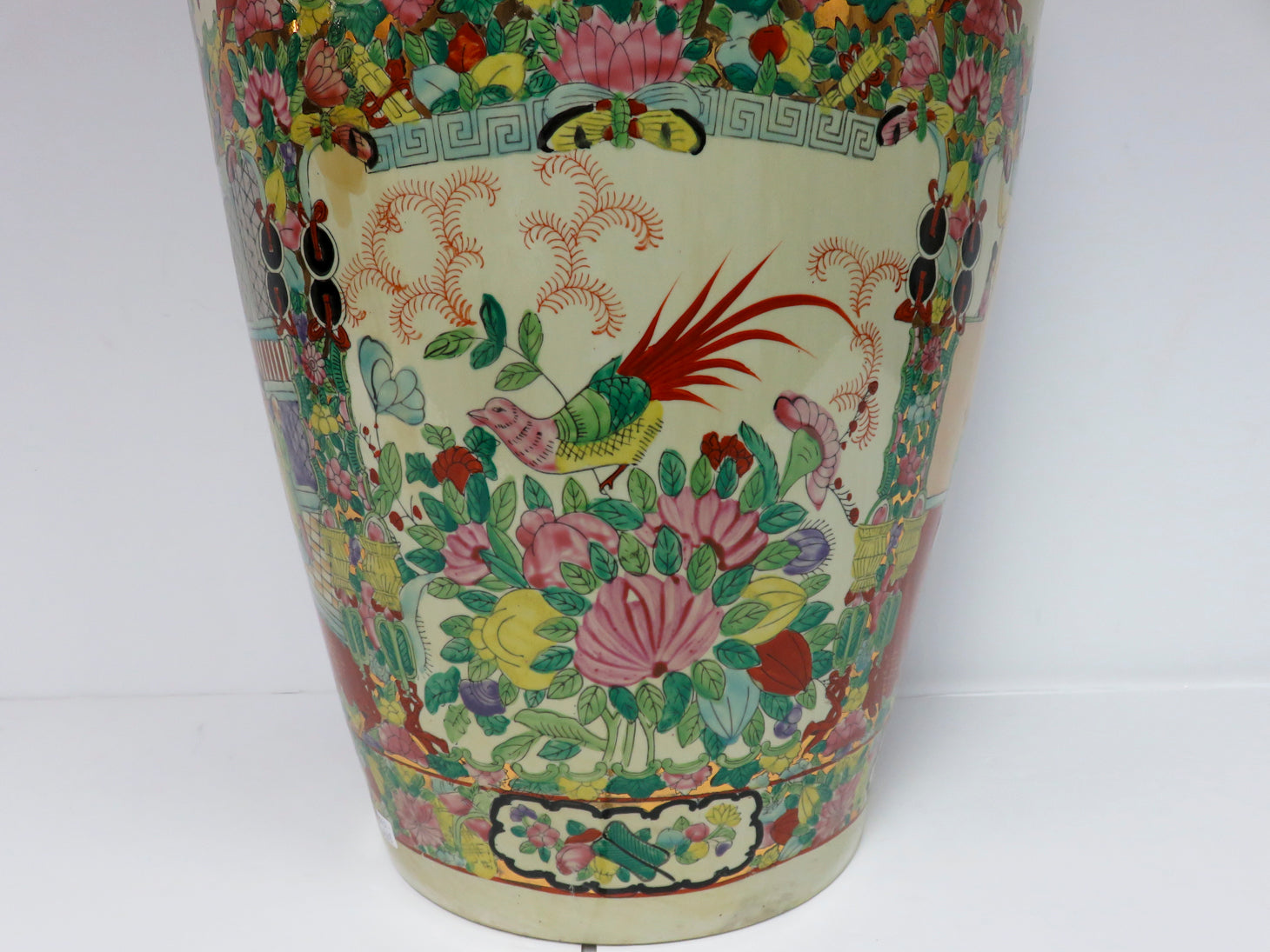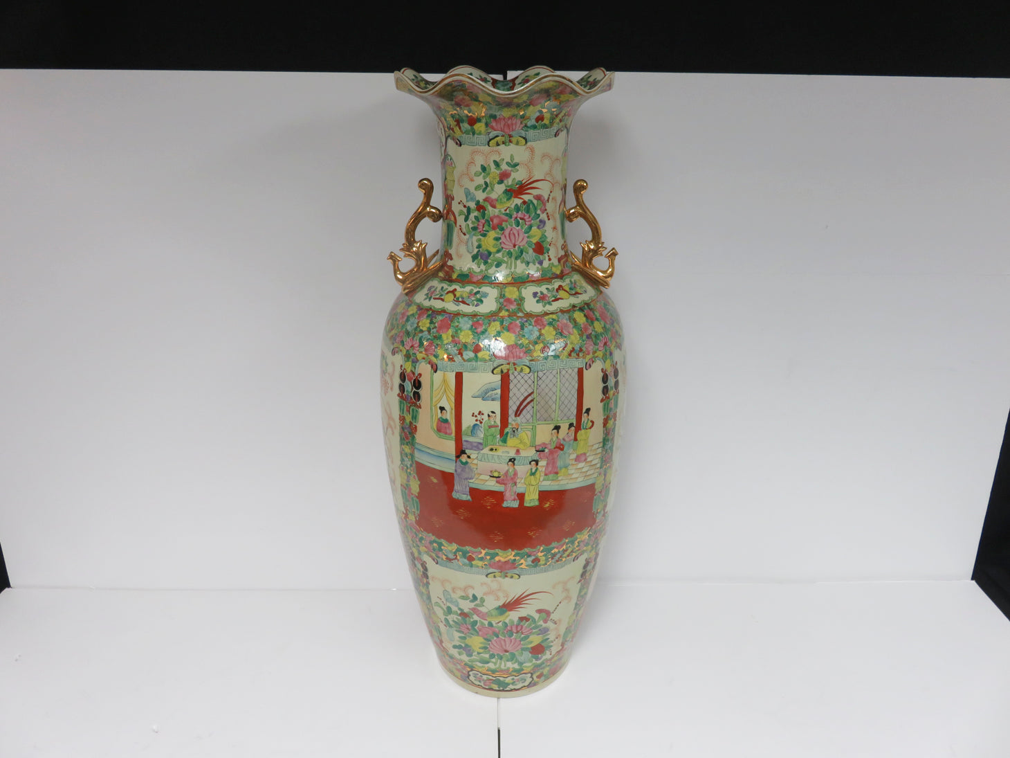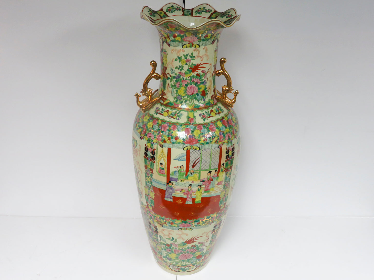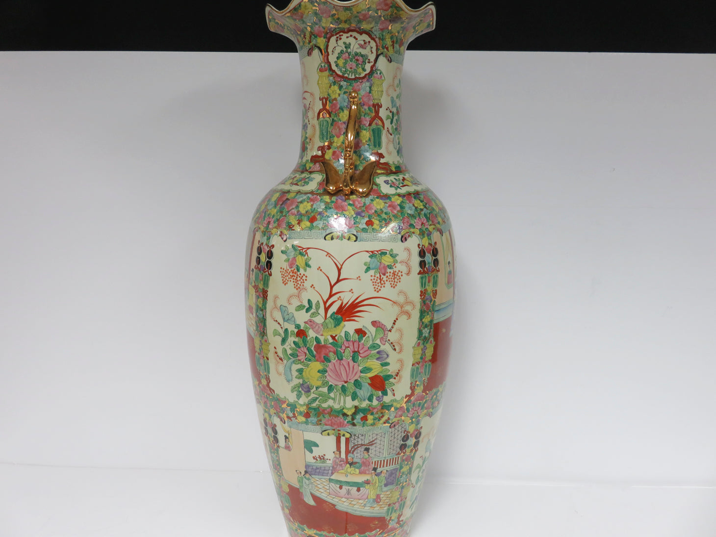 Detailed panels with traditional Chinese scenes, floral, bird and nature design in green, pink and yellow. It has ornate applied gold handles and scalloped edge 10.75" x 36" H