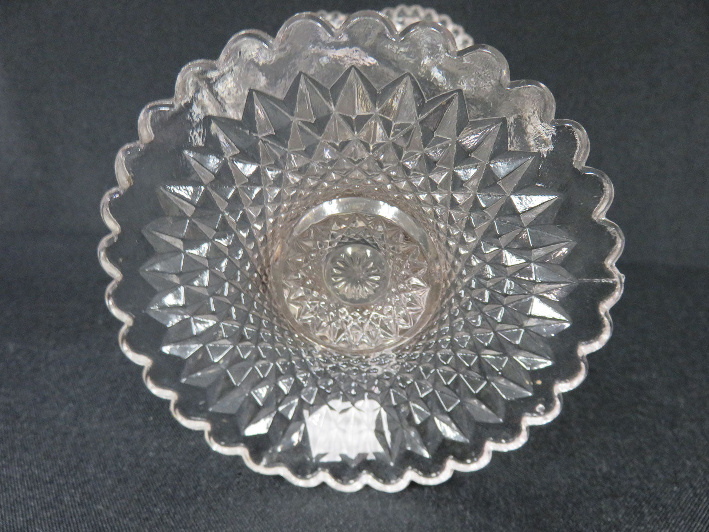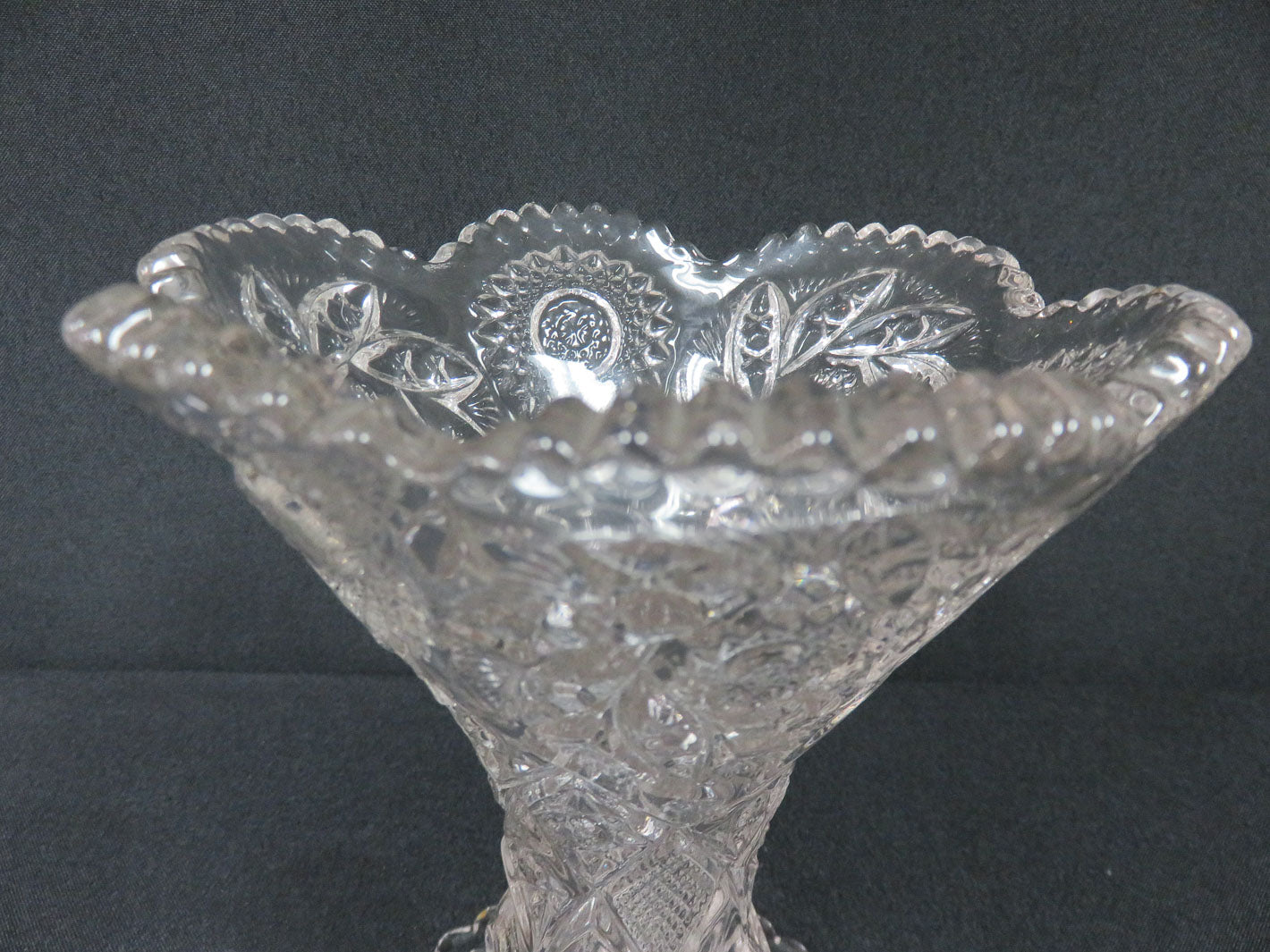 Pressed glass vase with hobstar, sawtooth edge and wide base