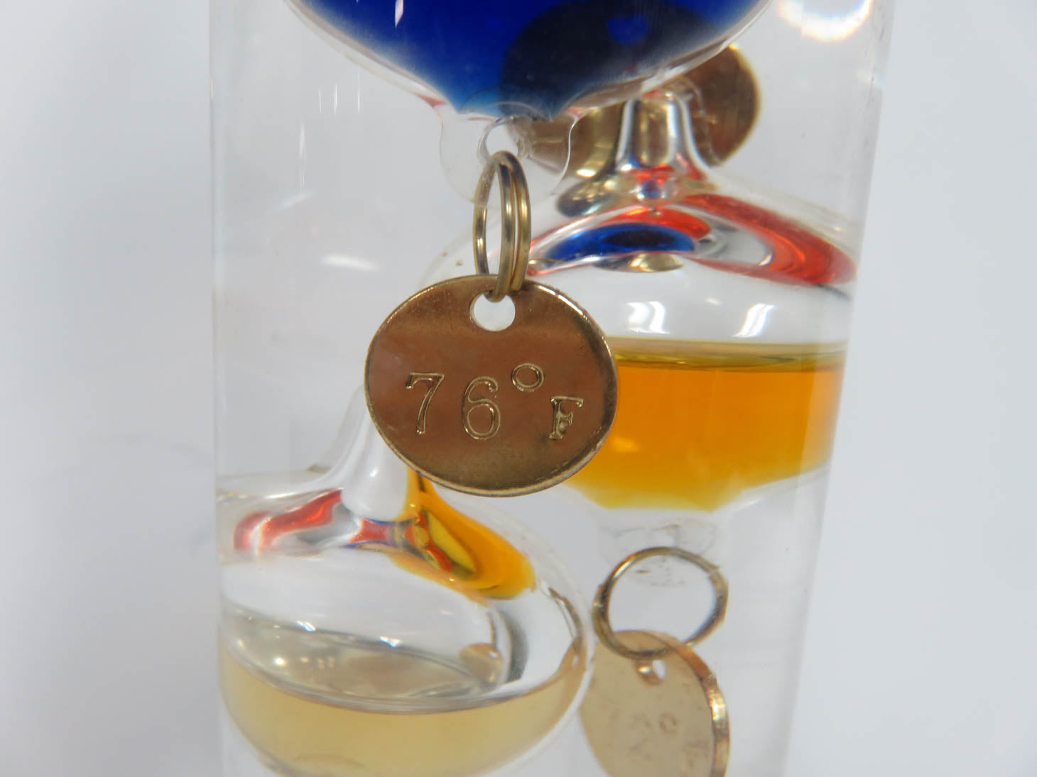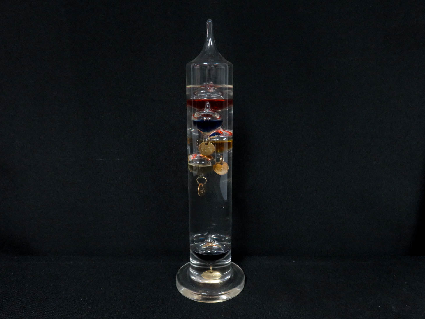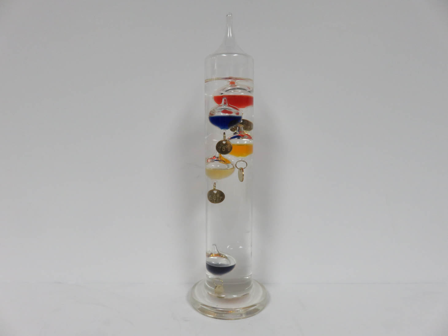 Sealed glass cylinder, filled with liquid and colorful glass bulbs, with metal temperature tags