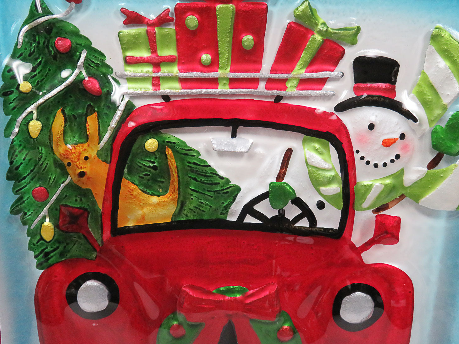 Snowman and reindeer in red car with gifts on top