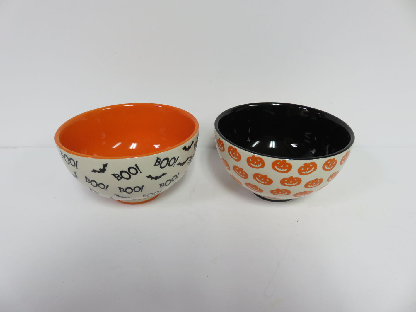 Set of 2, decorated with black "Boo and bats" and "orange pumpkins".