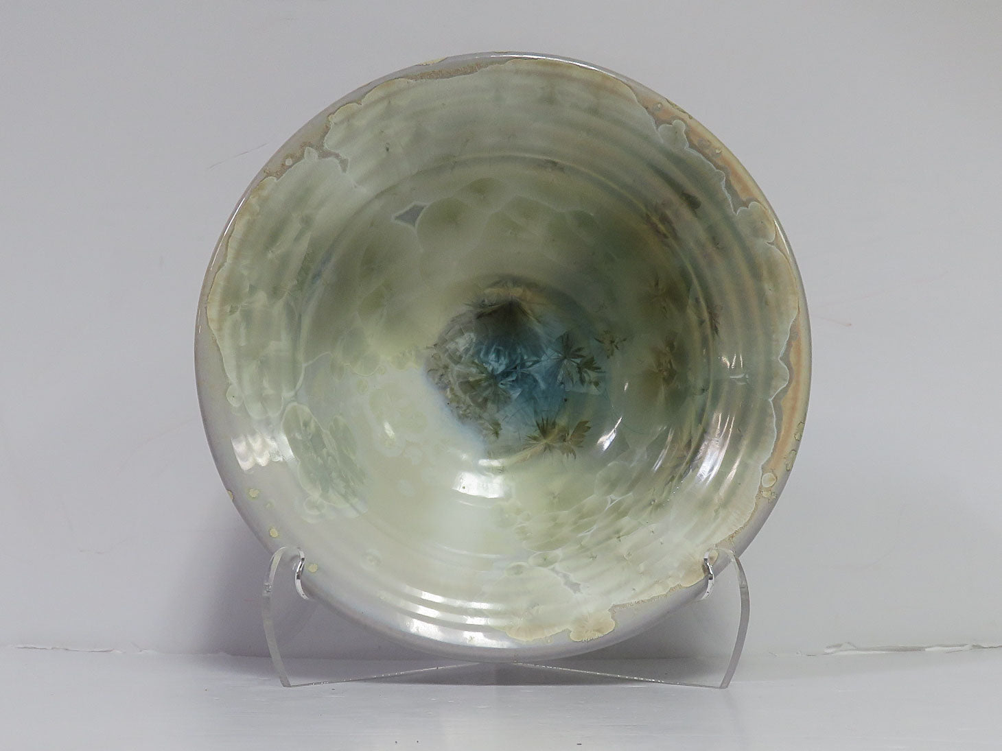 Crystalline Flambeaux glaze, Cream and sage interior, espresso brown exterior