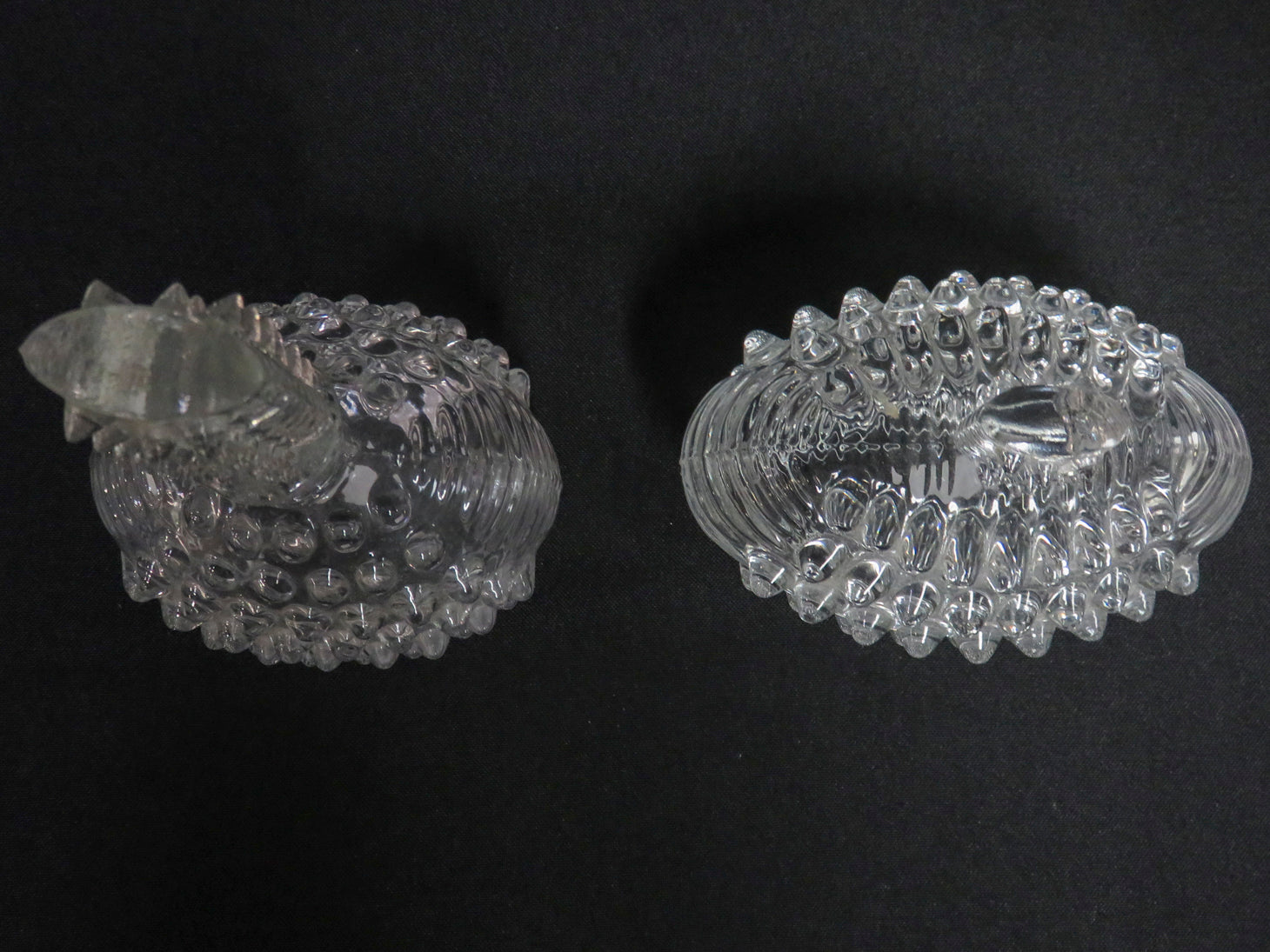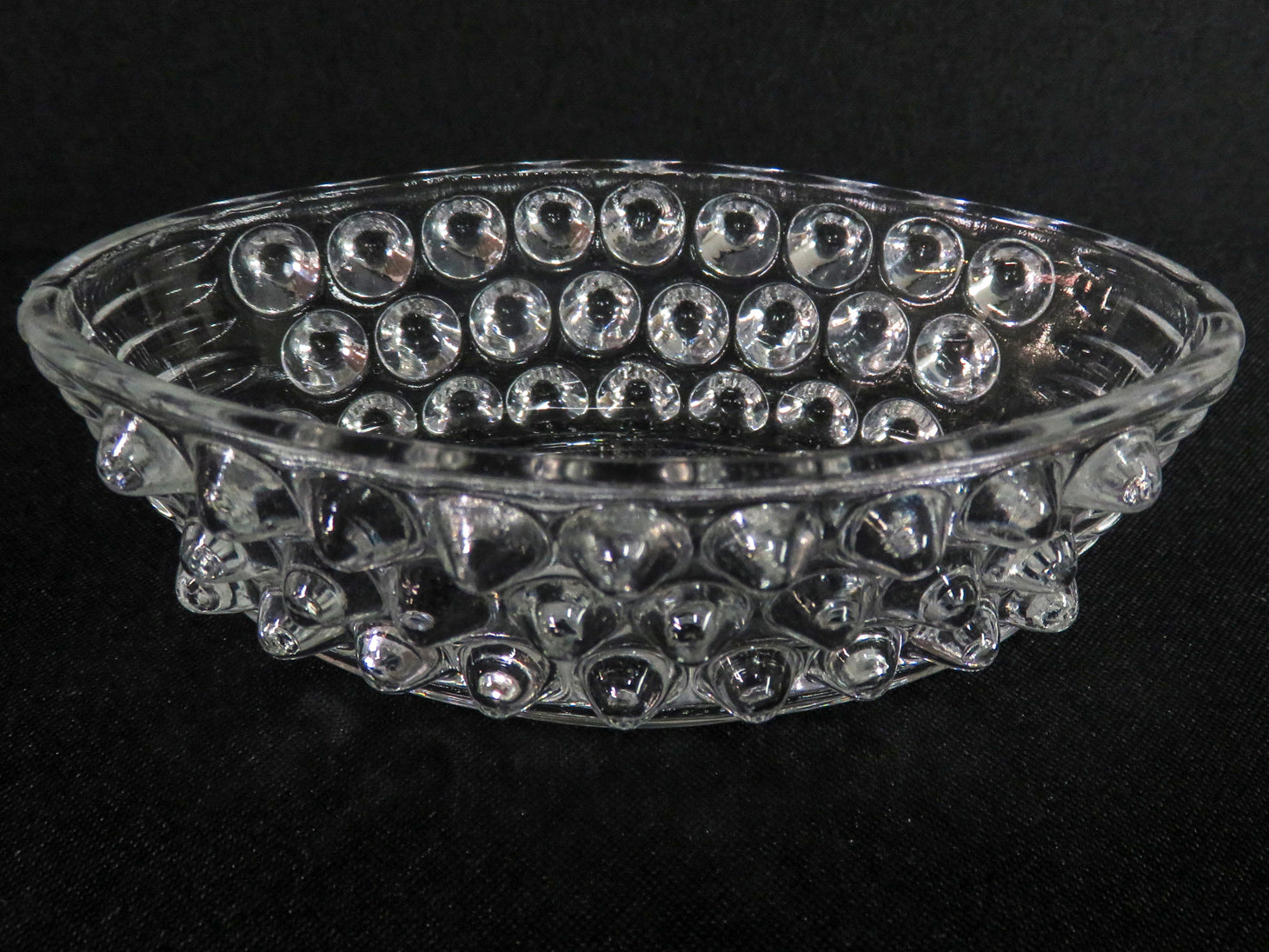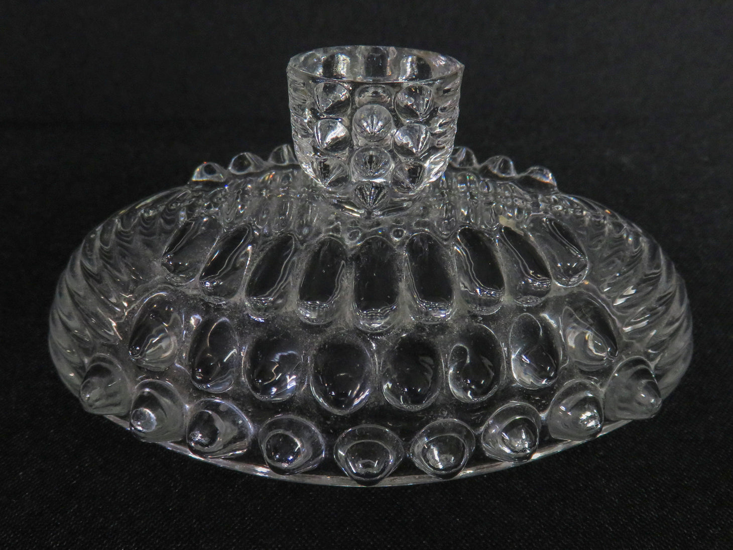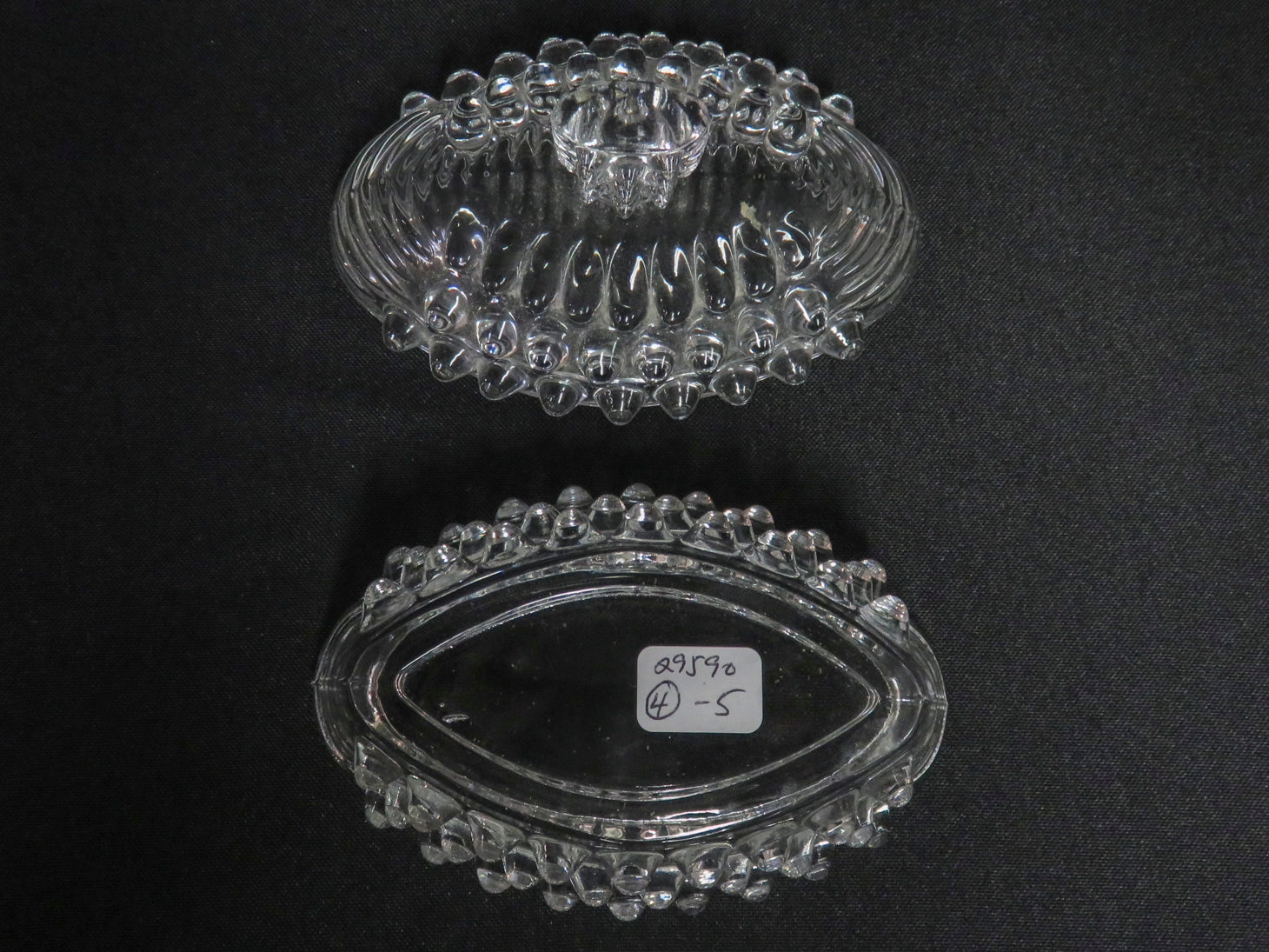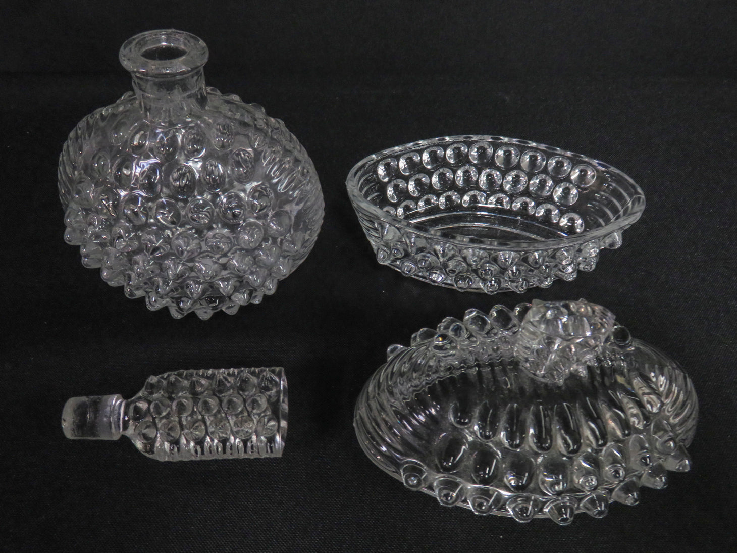 Clear perfume bottle with stopper and oval dish with lid. 4 pieces