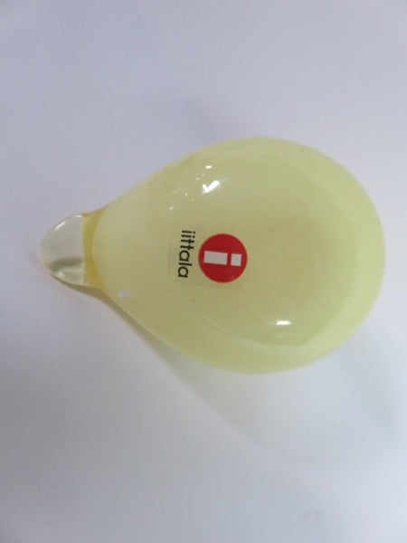 Yellow rounded body of hand-blown glass with clear yellow tinted head and tail.